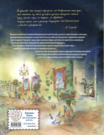 Великий русский режиссёр, основатель Московского Художественного театра К.С. Станиславский, покорённый чудесным сюжетом, писал, что «Синяя птица» — «наивна, проста, легка, жизнерадостна, весела и призрачна, как детский сон и, вместе с тем, величава». Неудивительно, что этой сказкой был очарован выдающийся художник современности Анатолий Михайлович Елисеев. Замечательный мастер, посвятивший жизнь иллюстрациям к детской классике, воплотил волшебные миры М. Метерлинка в романтичных, фантазийных акварелях.