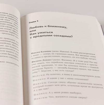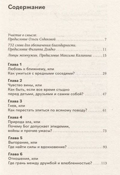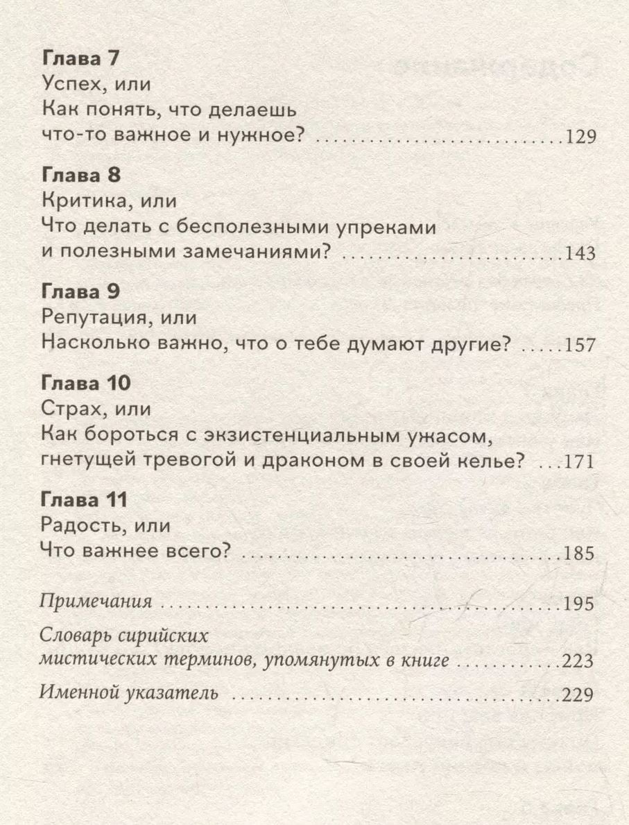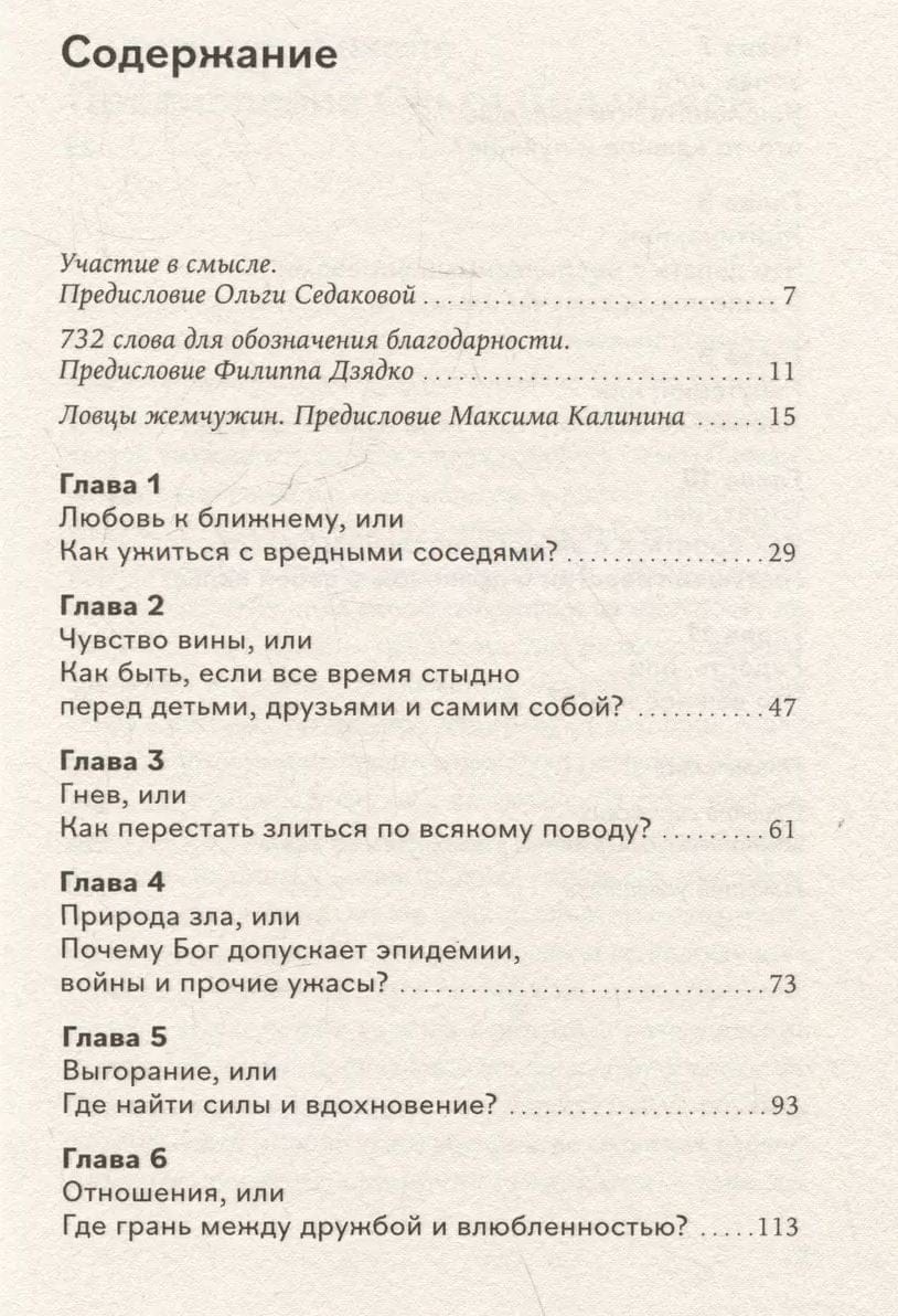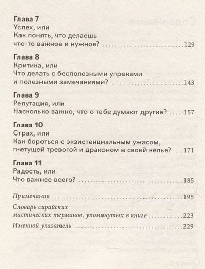 Книга построена в форме диалога и разделена на главы, в которых рассмотрены такие важные темы, как природа зла, любовь к ближнему, чувство вины, выгорание, критика, страх, успех, радость.