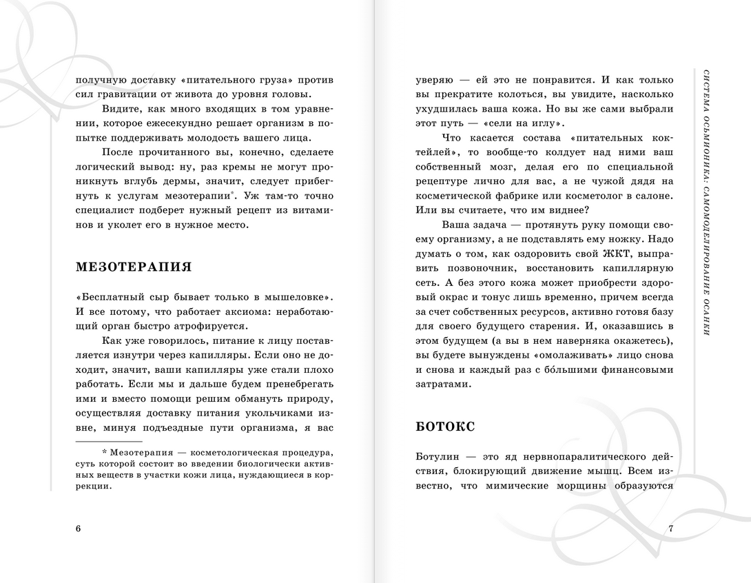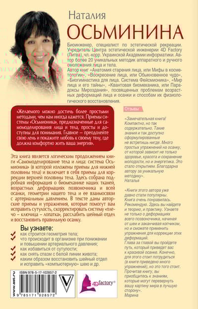 Эта книга является логическим продолжением книги «Самомоделирование тела и лица: система Осьмионика» (в которой изложены приемы для нижней половины тела) и включает в себя приемы для коррекции верхней половины тела. Здесь собрана подробная информация о биомеханике наших тканей, возрастных деформациях позвоночника и всей осанки, геометрии нашего тела и ее взаимосвязи с артериальным давлением. В тексте даны авторские приемы и упражнения, которые помогут вам исправить сутулость, скорректировать систему «плечо – ключица – лопатка», расслабить шейный отдел и восстановить правильную осанку.