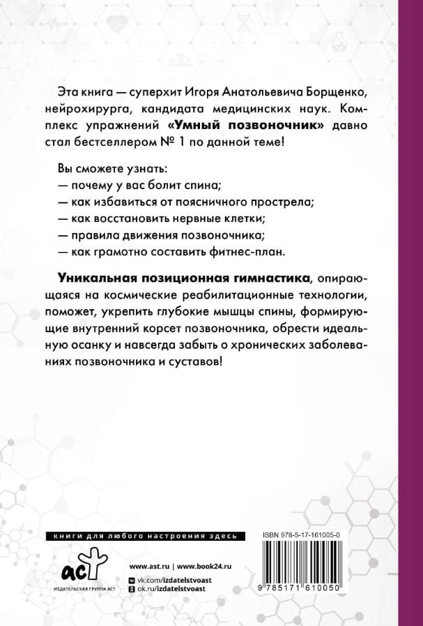 Эта книга — суперхит Игоря Анатольевича Борщенко, нейрохирурга, кандидата медицинских наук. Комплекс упражнений «Умный позвоночник» давно стал бестселлером № 1 по данной теме!