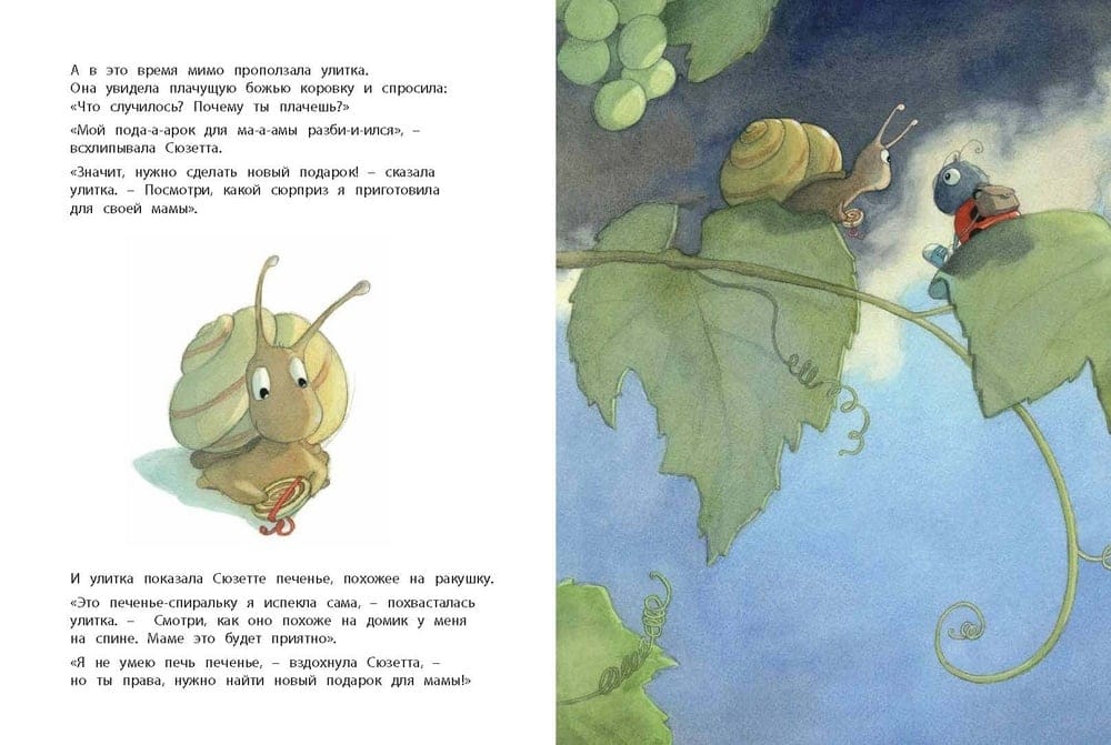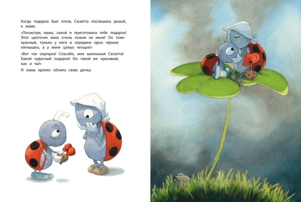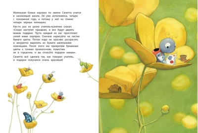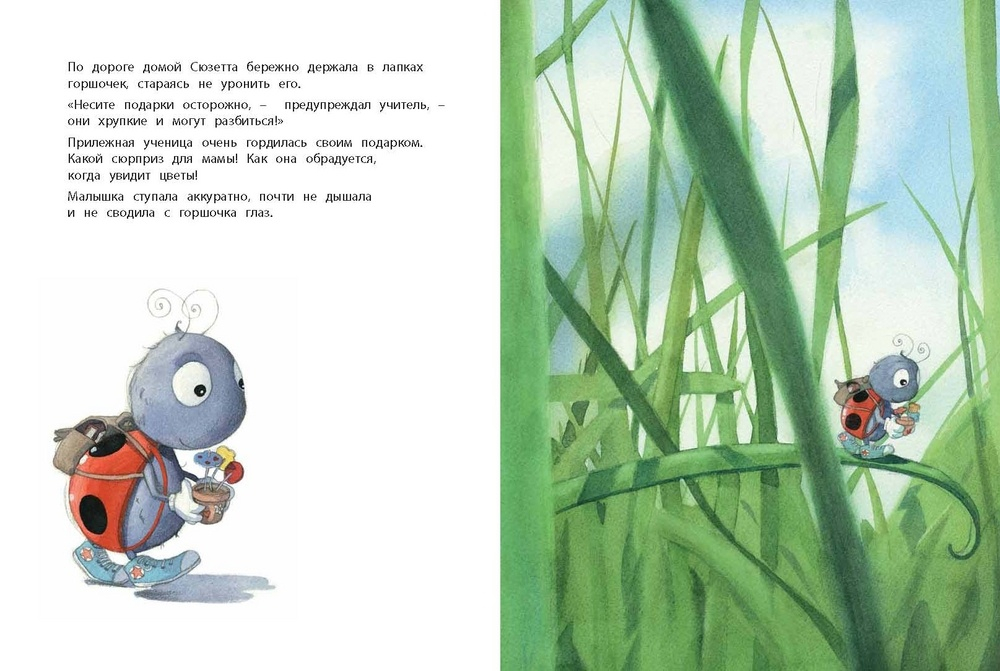 К празднику все ученики насекомьей школы приготовили своим мамам сюрприз. Маленькая божья коровка Сюзетта очень старалась и смастерила чудесный горшочек с цветами. Но случилась досадная неприятность: по дороге домой подарок разбился! Сюзетта обратилась за помощью к обитателям леса и благодаря добрым советам улитки, гусеницы, паучка, пчелки и муравья сумела сделать превосходный подарок самостоятельно.