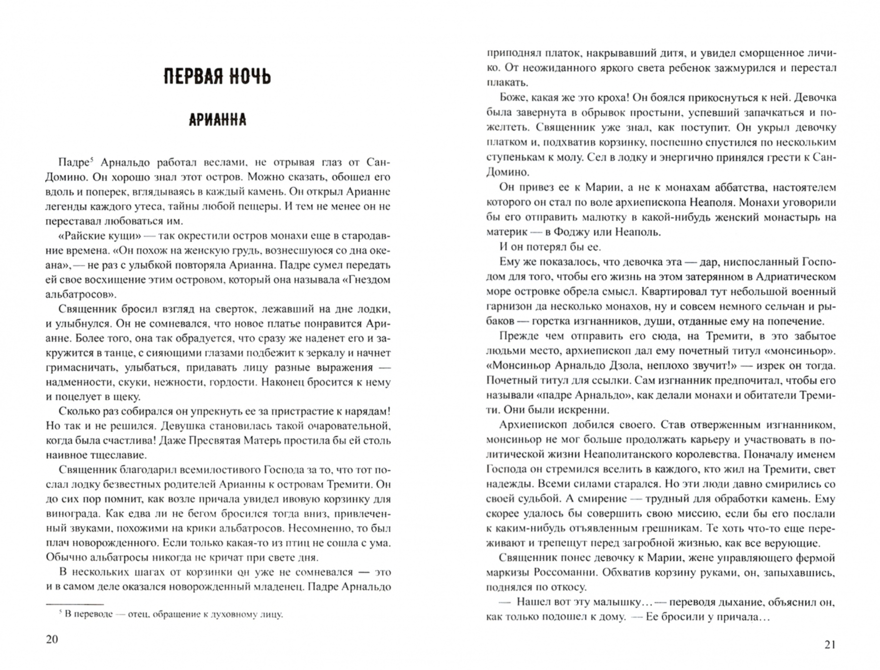 Более двухсот лет назад на берегу крохотного итальянского островка Сан-Домино сельский священник нашел ивовую корзинку с новорожденной девочкой. Спустя годы воспитанница прелата, названная Арианной, стала красавицей «с сияющим взглядом, светлой кожей и с волосами цвета спелой пшеницы». Ее жизнь, наполненная невероятными событиями и страстной любовью, пришлась на годы славы Наполеона Бонапарта, а ее судьба причудливым образом переплелась с судьбой нашей современницы, известной журналистки Серены Видали. Поверить в такую странную связь почти невозможно, однако над ней не властны ни время, ни обстоятельства...