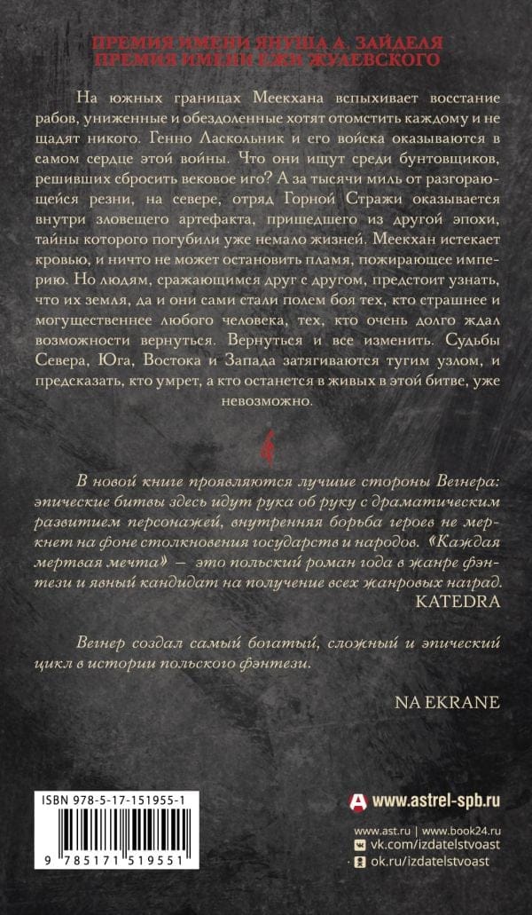 Пятая книга «Сказаний Меекханского пограничья» в новом оформлении. Один из самых популярных польских фэнтези-циклов современности. Для всех поклонников «Ведьмака», «Властелина колец» и «Песни льда и пламени». Империя охвачена огнём. На южных границах Меекхана вспыхивает восстание рабов. Униженные и обездоленные повстанцы стремятся отомстить за былые обиды и не щадят никого. В самое сердце новой войны отправляется Генно Ласкольник и его отряд. Тем временем на далеком севере отряд Горной Стражи под командованием лейтенанта Кеннета-лив-Даравита оказывается внутри зловещего артефакта родом из совсем другой эпохи. А бывший вор Альтсин изучает загадки далёкого прошлого. Никто из них и не подозревает, что Меекхан становится полем боя тех, кто страшнее и могущественнее любого человека и кто очень долго ждал возможности вернуться и всё изменить. Судьбы Севера, Юга, Востока и Запада сплетаются в тугой клубок, и уже невозможно предсказать, кто падет в этой борьбе, а кто останется в живых.