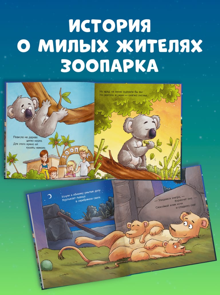 Маленькая коала живет в зоопарке, она только и делает, что ест. А потом спит. А потом снова ест. Ест зеленые листья и спит, уцепившись за ветку дерева. А что делали днем ее друзья? Львята играли и боролись, но вот пришел вечер, мама-львица уложила своих малышей спать. А кенгуру? Она скакала весь день и вот устала и тоже собирается прилечь.