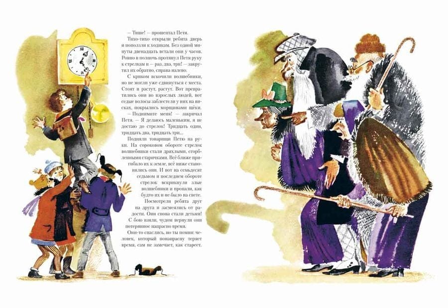 Самый добрый сказочник на свете Евгений Львович Шварц написал забавную по форме и очень глубокую по смыслу сказку о том, как четыре школьника в одночасье стали старичками и старушками, потому что вечно опаздывали и даром теряли драгоценное время. Живые, остроумные и красочные иллюстрации к сказке нарисовала талантливая художница Ирина Ивановна Казакова. Её старенькие мальчишки и молоденькие дедушки напоминают маленькому читателю простую истину: человек, который понапрасну теряет время, сам не замечает, как стареет…