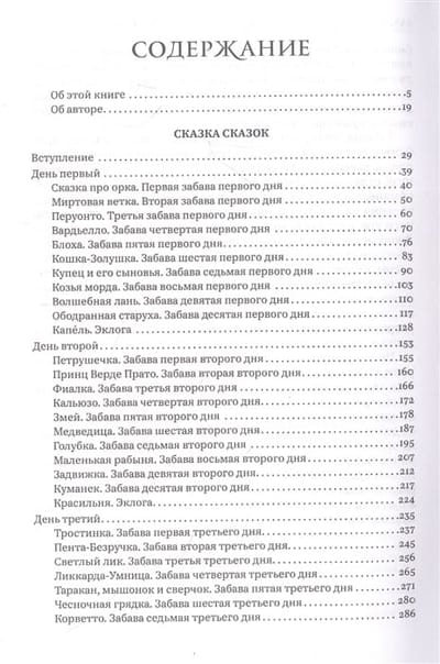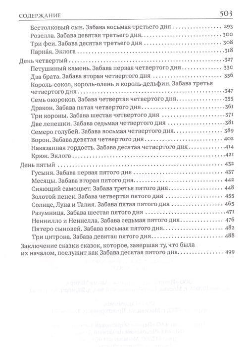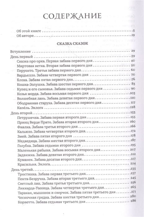 Предлагаем вниманию читателя первый в истории европейской литературы сборник сказок — книгу неаполитанского писателя Джамбаттисты Базиле (1566–1632), так и озаглавленную — «Сказка сказок». В сказку о юной принцессе, покинувшей дворец в поисках предсказанного ей жениха, как в рамку, заключены пятьдесят других историй, разделенных по пяти дням (отсюда второе название, под которым известна эта книга — «Пентамерон»). Сюжеты и мотивы Базиле оказали влияние на многих сказочников последующих веков — как прямое (на Шарля Перро, Карло Гоцци и братьев Гримм), так и опосредованное (вплоть до А. С. Пушкина, П. П. Ершова и П. П. Бажова). Однако неповторимым произведением прозы барокко делают книгу Базиле не столько сюжеты, сколько яркий авторский стиль — насыщенность повествования бытовыми реалиями Италии XVII в., пословицами и поговорками, цитатами латинских и итальянских авторов, детским фольклором, образцами жаргона студентов, солдат и карточных шулеров...