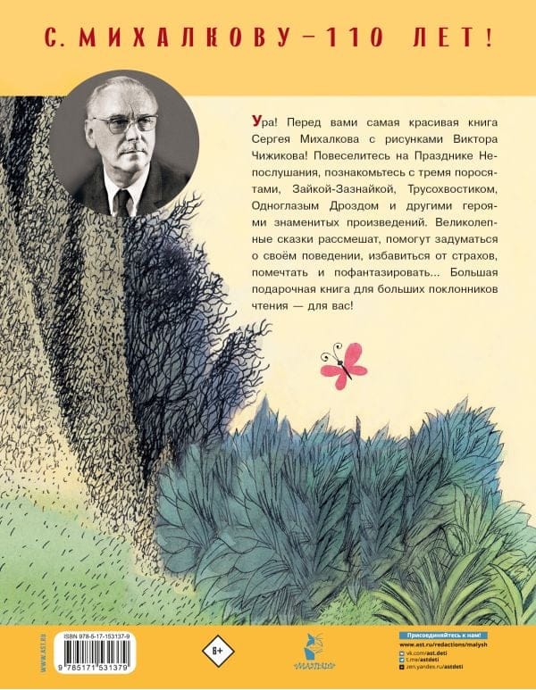 В книгу «Сказки» вошли самые знаменитые произведения Сергея Михалкова: «Праздник Непослушания», «Зайка-Зазнайка», «Трусохвостик», «Три поросёнка» и другие. Каждая страница — это клад, в котором спрятаны смех, мудрость, мечты и великолепные иллюстрации «папы» Олимпийского Мишки Виктора Чижикова. Эта великолепная книга издана к 110-летнему юбилею Сергея Михалкова — писателя, поэта, сценариста, военного корреспондента, автора гимна Российской Федерации и человека, который подарил нашим детям самых любимых героев стихов и сказок! Для младшего школьного возраста.