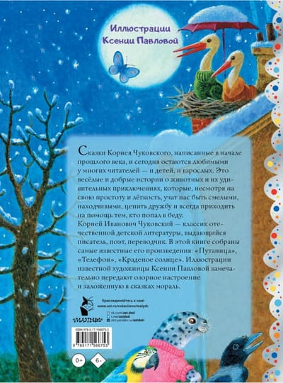 Сказки Корнея Чуковского, написанные в начале прошлого века, и сегодня остаются любимыми у многих читателей — и детей, и взрослых. Это весёлые и добрые истории о животных и их удивительных приключениях, которые, несмотря насвою простоту и лёгкость, учат нас быть смелыми, находчивыми, ценить дружбу и всегда приходить на помощь тем, кто попал в беду.Корней Иванович Чуковский — классик отечественной детской литературы, выдающийся писатель, поэт, переводчик. В этой книге собраны самые известные его произведения: «Путаница», «Телефон», «Краденое солнце». Иллюстрации известной художницы Ксении Павловой замечательно передают озорное настроение и заложенную в сказках мораль.