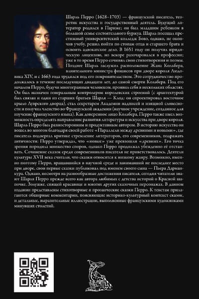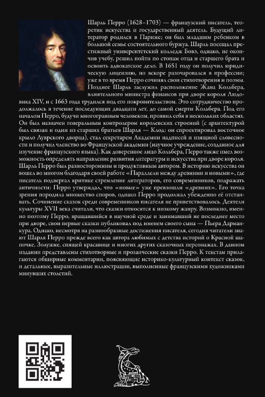 Шарль Перро был разносторонним и продуктивным автором. В историю искусства он вошел во многом благодаря своей работе «Параллели между древними и новыми», где писатель подвергал критике стремление литераторов, его современников, подражать античности: Перро утверждал, что «новые» уже превзошли «древних». Его точка зрения породила множество споров, однако Перро продолжал убежденно её отстаивать. Сочинение сказок среди современников писателя не приветствовалось. Деятели культуры XVII века считали, что сказки относятся к низкому жанру. Возможно, именно поэтому Перро, вращавшийся в научной среде и занимавший не последнее место при дворе, свои первые сказки публиковал под именем своего сына — Пьера Дарманкура. Однако, несмотря на разнообразные достижения писателя, сегодня читатели знают Шарля Перро прежде всего как автора любимых с детства историй о Красной шапочке, Золушке, спящей красавице и многих других сказочных персонажах. В данном издании представлены стихотворные и прозаические сказки Перро. К текстам прилагаются обширные комментарии, поясняющие историко-культурный контекст сказок, и детальные, выразительные иллюстрации, выполненные французскими художниками минувших столетий.