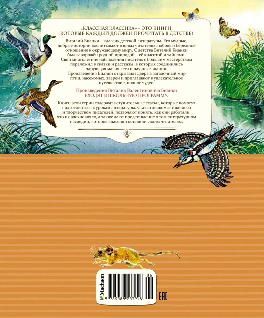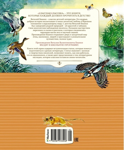Виталий Бианки – классик детской литературы. Его мудрые, добрые истории воспитывают в юных читателях любовь и бережное отношение к окружающему миру. С детства Виталий Бианки был заворожён родной природой – её красотой и тайнами. Свои многолетние наблюдения писатель с большим мастерством переложил в сказки и рассказы, в которых соединились чарующая магия леса и научные знания. Произведения Бианки открывают дверь в загадочный мир птиц, насекомых, зверей и приглашают в увлекательное путешествие, полное чудес.