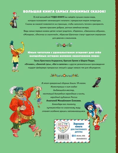 Иллюстрации к книге тоже созданы настоящим волшебником! Выдающийся мастер, народный художник России Анатолий Михайлович Елисеев воплотил яркие сказочные миры на бумаге, создал незабываемые образы героев и даже придумал продолжение к сказке про курочку Рябу. Вы найдёте его в смешной и задорной фантазии «Яичко».