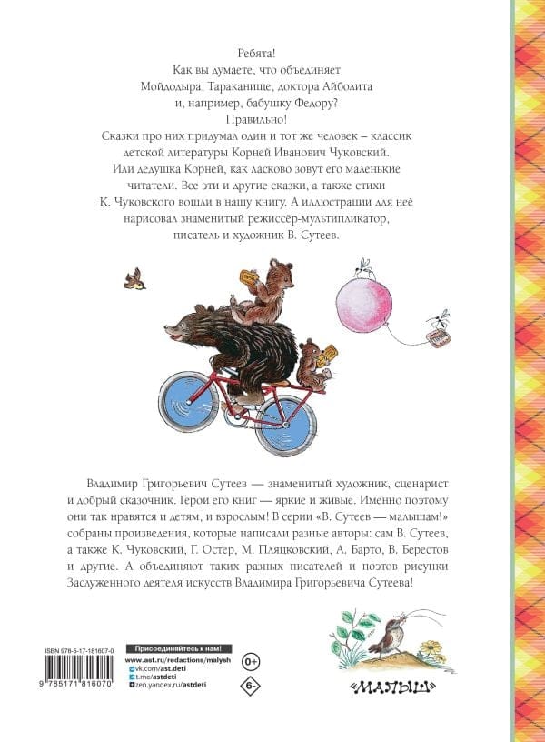 Вот уже много лет К. Чуковский остаётся одним из самых читаемых детских писателей и неизменно занимает первые строчки всевозможных читательских рейтингов. В сборник «Сказки К. Чуковского в рисунках В. Сутеева» вошли все самые известные сказки Корнея Ивановича Чуковского — «Айболит», «Тараканище», «Мойдодыр» и другие, а также английские народные песенки в рисунках знаменитого художника-иллюстратора, писателя и сценариста В. Сутеева.