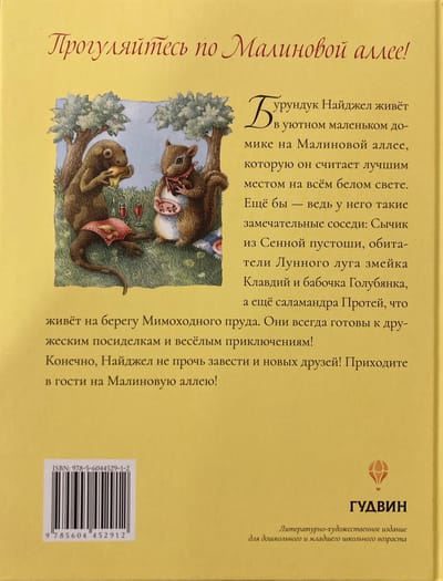 Бурундук Найджел живёт в уютном маленьком домике на Малиновой аллее, которую он считает лучшим местом на всём белом свете. Ещё бы – ведь у него такие замечательные соседи! Они всегда готовы к дружеским посиделкам и даже к приключениям! Сычик из Сенной пустоши, змейка Клавдий и бабочка Голубянка – обитатели Лунного луга и саламандра Протей, что живёт на берегу Мимоходного пруда. Конечно, Найджел не прочь завести и новых друзей! Приходите в гости на Малиновую аллею!