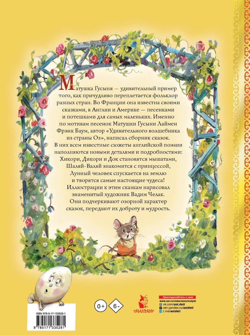 Матушка Гусыня — удивительный пример того, как причудливо переплетается фольклор разных стран. Во Франции она известна своими сказками, в Англии и Америке — песенками и потешками для самых маленьких. Именно по мотивам песенок Матушки Гусыни Лаймен Фрэнк Баум, автор «‎Удивительного волшебника из страны Оз»‎, написал сборник сказок.