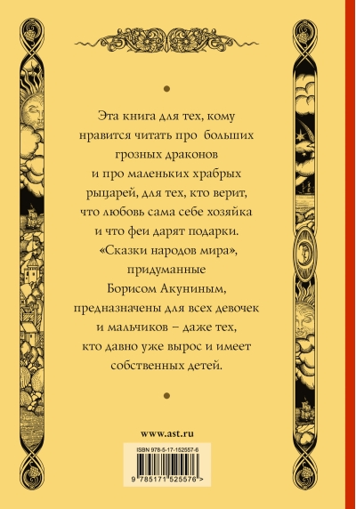 Эта книга для тех, кому нравится читать про больших грозных драконов и про маленьких храбрых рыцарей, для тех, кто верит, что любовь сама себе хозяйка и что феи дарят подарки. «Сказки народов мира», придуманные Борисом Акуниным, предназначены для всех девочек и мальчиков — даже тех, кто давно уже вырос и имеет собственных детей.
