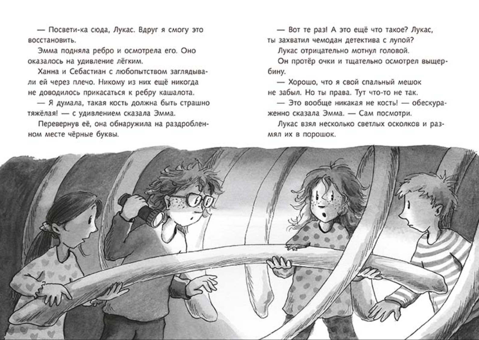 Наконец-то они оказались в Китовом музее, познакомились с многочисленными обитателями Северного моря и увидели главный экспонат – огромный скелет настоящего кашалота (кашалот, как известно, относится к подотряду зубатых китов). Но что это? Рёбра кашалота поддельные! Какие-то злоумышленники крадут драгоценную китовую кость, заменяя фрагменты скелета гипсовыми подделками. Эмма и Лукас сразу же начали расследование и быстро напали на след банды, торгующей китовой костью. Это колоритные персонажи Дылда и Карман, а также их босс Рубильник.