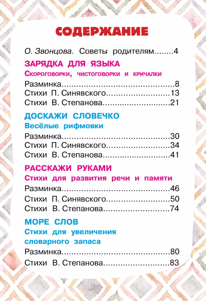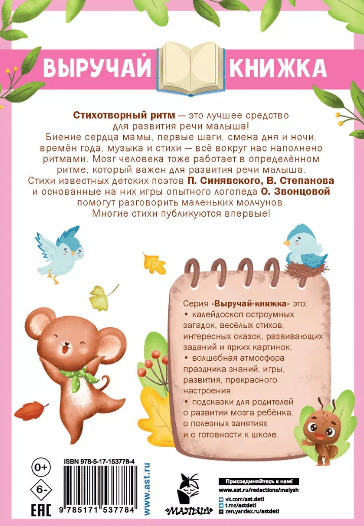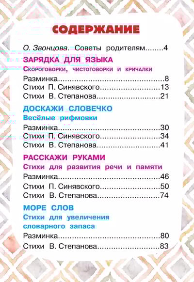 Развитие речи неразрывно связано с развитием мышления ребенка. Поэтому очень важно создать богатую, грамотную речевую среду, которая поможет малышу говорить правильно и красиво, расширит кругозор и увеличит словарный запас. В этой выручай-книге собраны веселые стихи, скороговорки, кричалки любимых детских авторов П. Синявского и В. Степанова. Многие из них публикуются впервые. Задания опытного учителя-логопеда О. Звонцовой помогут маленьким молчунам преодолеть небольшую темповую задержку, улучшат память, внимание. Красочная и увлекательная книга станет прекрасным подарком для маленьких непосед.