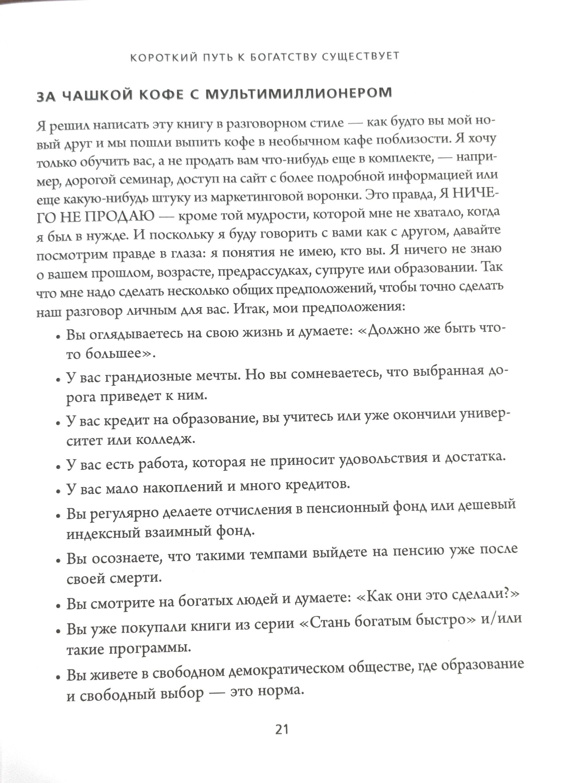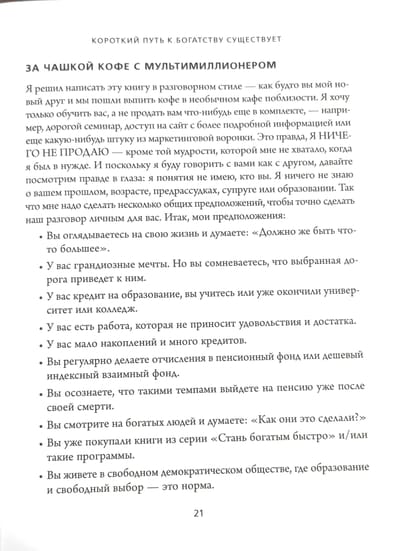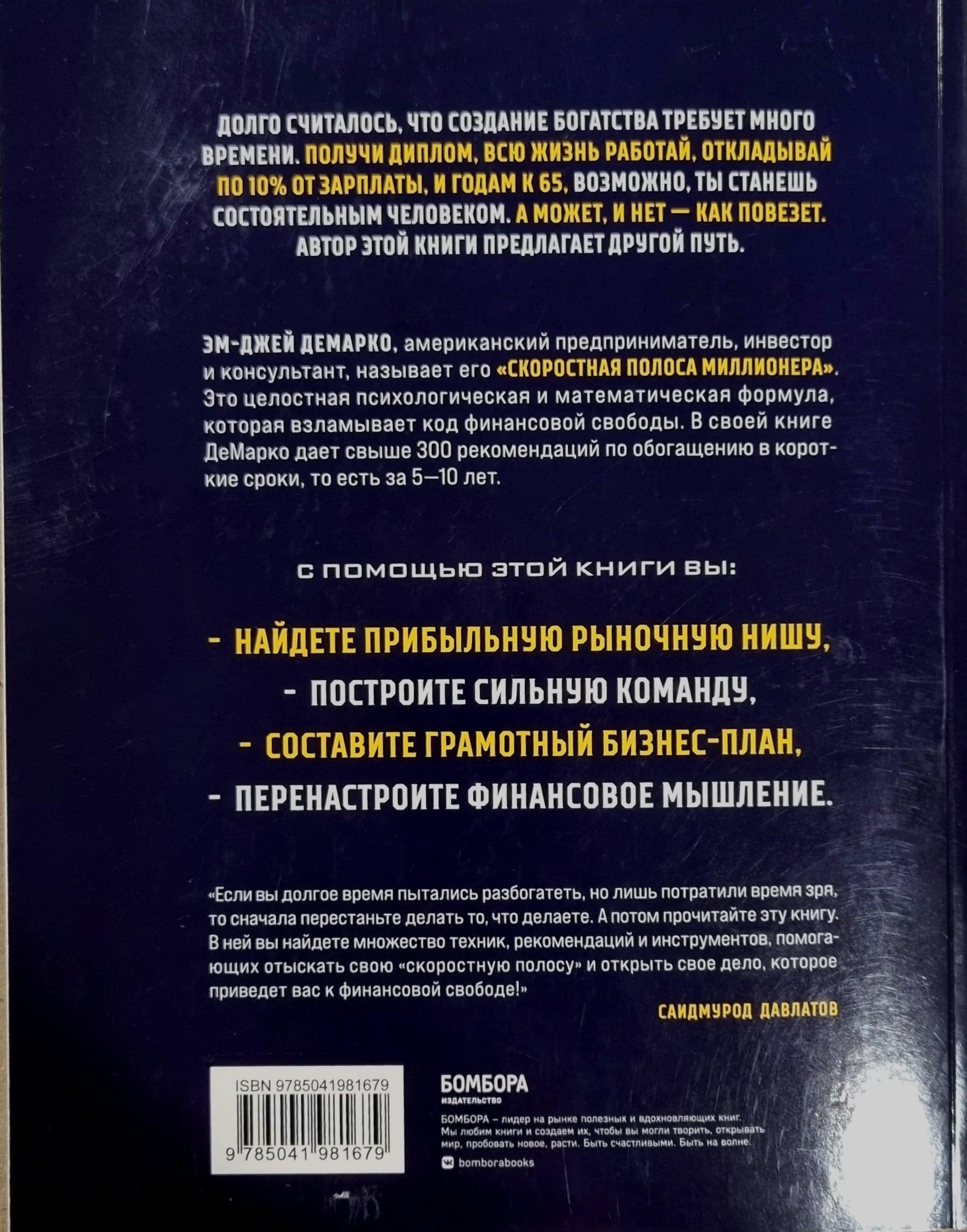 Долго считалось, что создание богатства требует много времени. Получи диплом, всю жизнь работай, откладывай по 10% от зарплаты, и годам к шестидесяти пяти, возможно, ты станешь состоятельным человеком. А может, и нет — как повезет. Автор этой книги предлагает другой путь. Эм-Джей ДеМарко, американский предприниматель, инвестор и консультант, называет его «Скоростная полоса миллионера». Это целостная психологическая и математическая формула, которая взламывает код финансовой свободы. В своей книге ДеМарко дает свыше 300 рекомендаций по обогащению в короткие сроки, то есть за 5—10 лет.