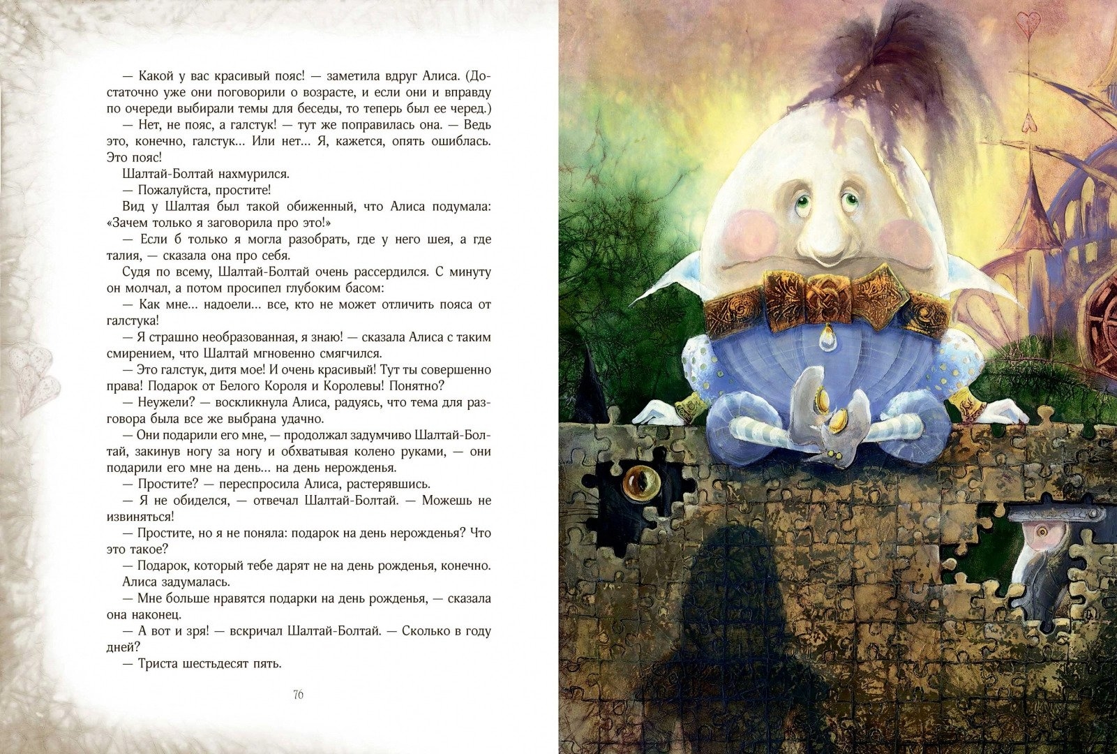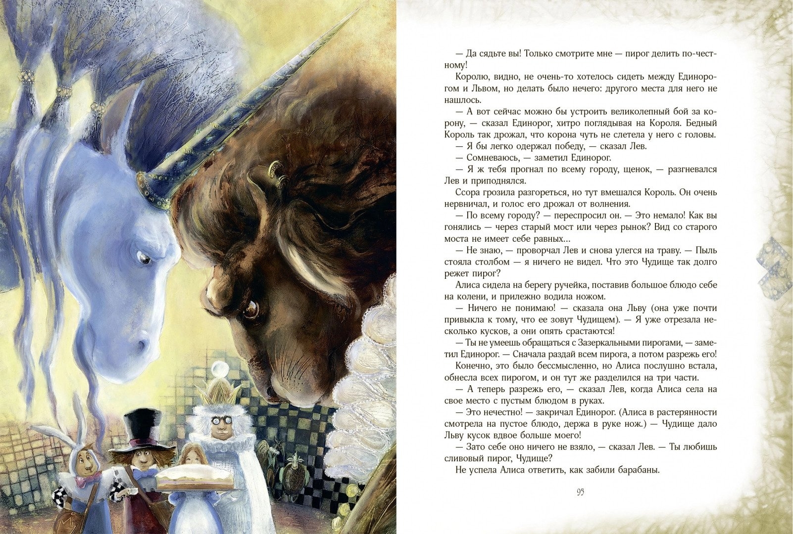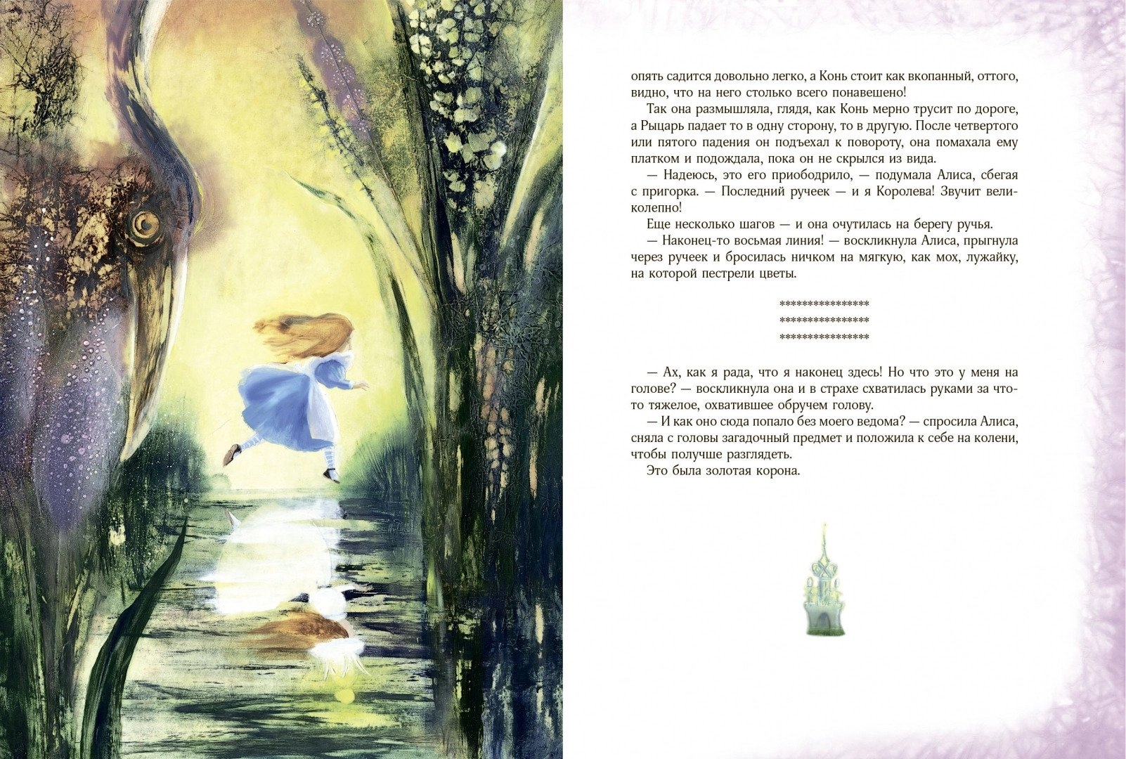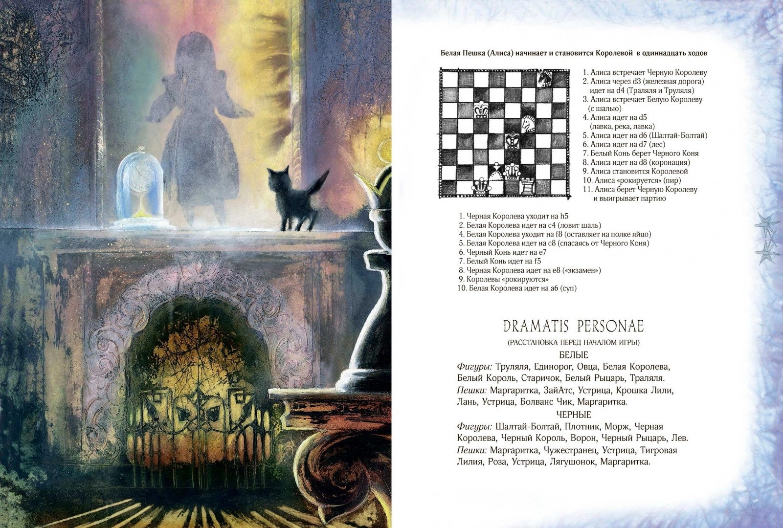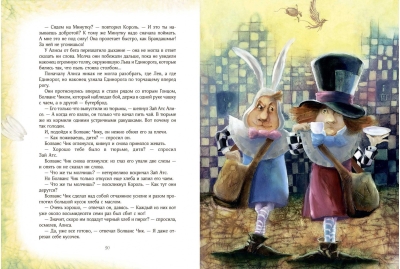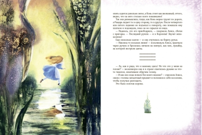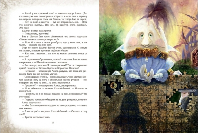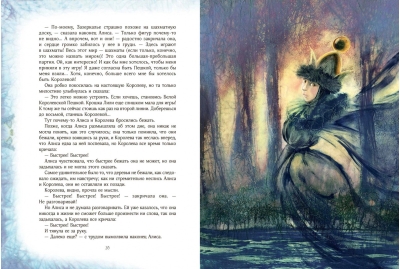 Все ходы проиллюстрировала Екатерина Костина в своей невероятной волшебной манере, в которой есть свой секрет. Иллюстрации погружают нас в таинственный и сложный мир, придуманный Клайвом Льюисом Кэроллом. Исследователи его многоплановых текстов говорят, что в них зашифрованы математические и философские загадки. А дети, читая, прекрасную и удивительную историю о маленькой, любопытной, отважной и рассудительной Алисе, отвечают исследователям: «Не загадки это, а просто… чудеса!».