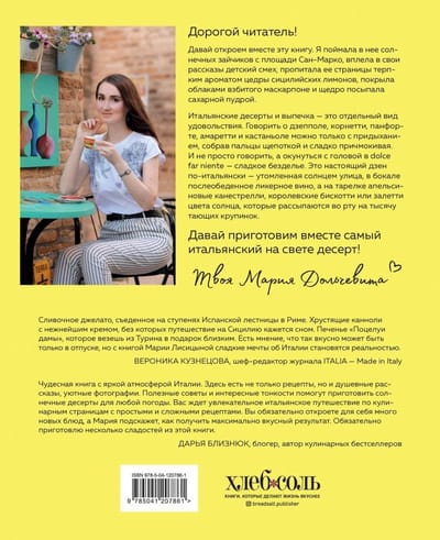 В Италии еда — это не просто топливо для организма, это то, о чем говорят часами, это снова и снова тема для жарких споров, это культурное наследие целой страны и отдельно взятой семьи, это способ сказать «я люблю тебя», а десерты — это вишенка на торте autentica cucina italiana. Итальянские десерты не терпят суеты и скорости, они не привыкли быть съеденными на ходу, для них нужно dolce far niente или попросту сладкое безделье, когда все срочные дела вдруг становятся не срочными, все важные встречи неважными и остается только одно - наслаждаться моментом и идельаным итальянским десертом. Рецепты солнечных десертов и выпечки собрала для вас в книгу Мария Лисицина - девушка с русскими корнями и итальянским сердцем. Давайте вместе приготовим сладкие торчетти, знаменитые амаретти, фаготтини с грушами и фантастически вкусные заварные пирожные «Дзепполе». Давайте готовить и наслаждаться!