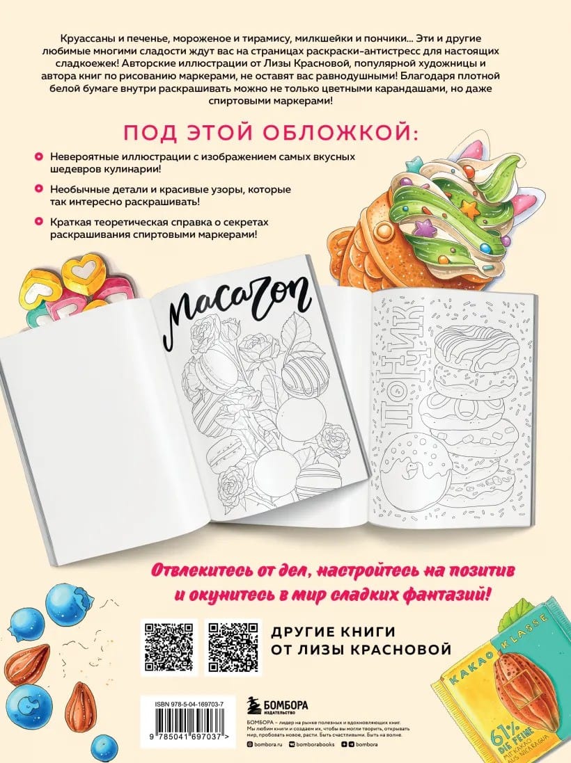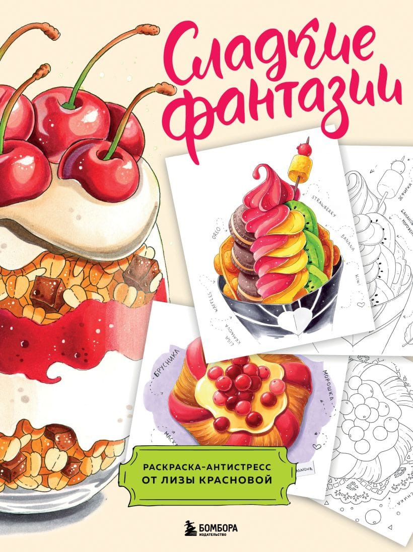 Давно хотели немного подсластить будни и наполнить жизнь яркими красками? Раскраска-антистресс «Сладкие фантазии» — то, что вам нужно! Экзотические фрукты, шоколадные десерты, согревающие напитки, ароматная выпечка — все это ждет вас на страницах раскраски от Лизы Красновой, популярной художницы и автора книг по рисованию «Маркеры! Все о цвете, материалах и скетчах» и «Раскрашиваем маркерами с Лизой Красновой. Пошаговые уроки», чьи рисунки покорили русскоязычный интернет.