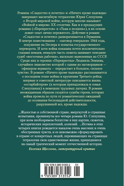 Романы «Сладостно и почетно» и «Ничего кроме надежды» завершают масштабную тетралогию Юрия Слепухина о Второй мировой войне, которую многие называют «Войной и миром» XX столетия. Как и в предыдущих романах («Перекресток» и «Тьма в полдень»), в их основе лежит опыт лично пережитого. Действие в романе «Сладостно и почетно» разворачивается в Германии. В центре повествования — «заговор генералов» 1944 года, покушение на Гитлера и попытка государственного переворота. И хотя война показана почти исключительно глазами немцев, немалую часть сюжета занимает описание судеб «восточных рабочих», насильно вывезенных из СССР. Среди них и героиня «Перекрестка» Людмила Земцева, случайное знакомство которой с одним из заговорщиков — офицером вермахта — перерастает в большое, сильное чувство.