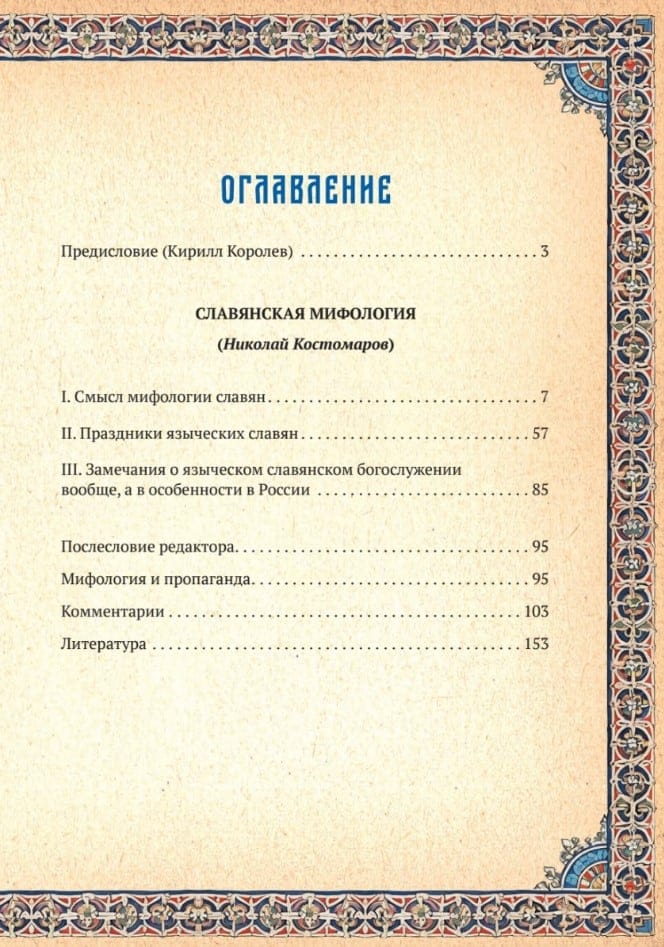 В данном издании Н. И. Костомаров занимается анализом славянской мифологии: изучает народные поэтические произведения (включая праздничные, семейные, любовные, солдатские, казацкие и свадебные песни), описывает демонологию и главных богов славян, а также праздники и традиции. Эту книгу можно считать справочником по истории, обычаям, повседневной жизни и культуре славянских народов.