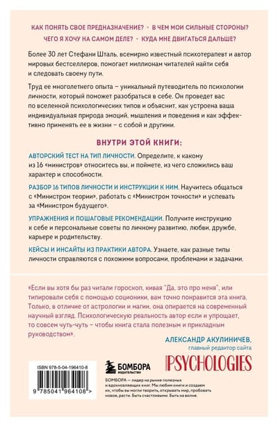 Практические упражнения и пошаговые рекомендации. Получите инструкцию к себе и персональные советы по личному развитию, любви, дружбе, карьере и родительству. Кейсы и инсайты из практики автора. Узнаете, как разные типы личности справляются с похожими вопросами, проблемами и задачами.