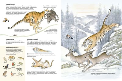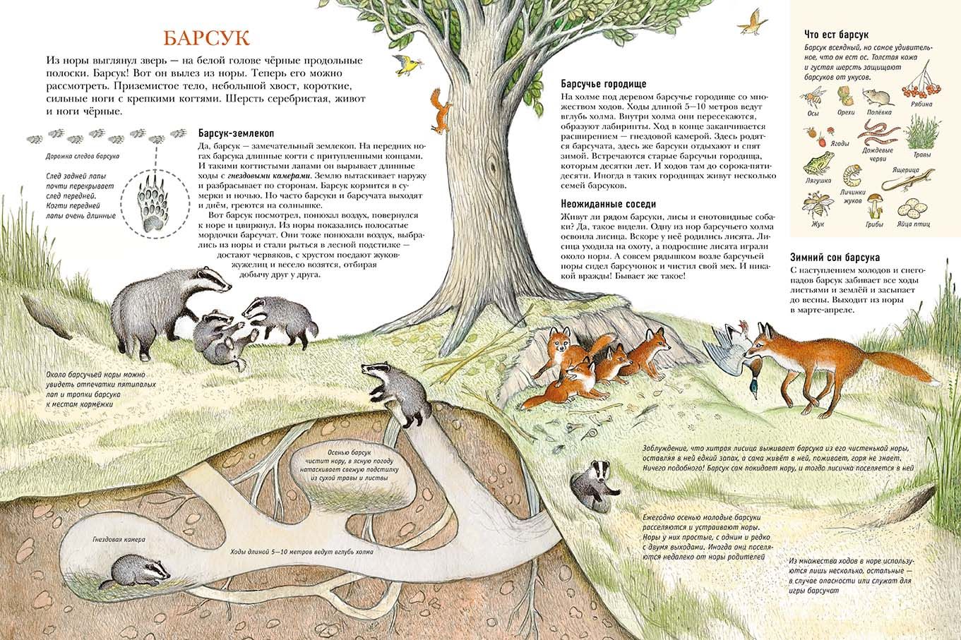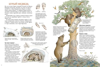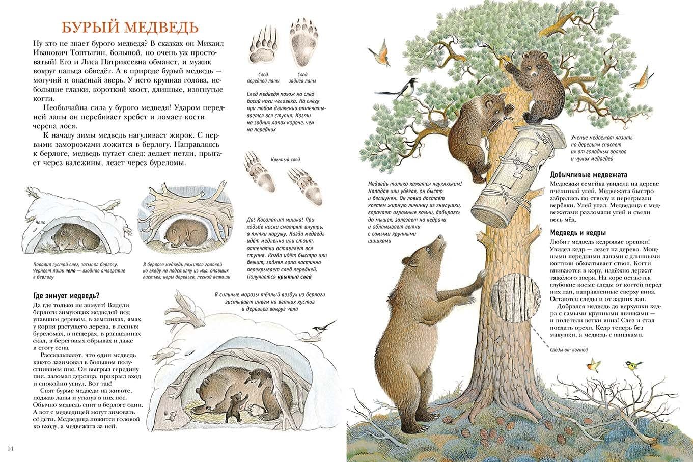 Открывая книгу с названием «Следы», ожидаешь узнать, как отличить отпечатки лап лисы от отпечатков волка, или лося от оленя. Но эта книга позволяет узнать куда больше. Само понятие следов тут рассматривается широко: так, мы узнаем о поройках – ямках, в которых рылись кабаны в поисках еды, обтёртой коре деревьев со следами зубов и когтей – это медведь метил территорию, о перьях и капельках крови, остающихся на снегу после тока и схваток тетеревов… Широк и охват животных, о которых идет речь в книге – от ежей и белок до амурского тигра, птички-кедровки и енотовидной собаки, причем узнаем мы не только об их следах, но и об основных повадках, питании и о занимательных фактах из жизни зверей и птиц. Рисунки очень реалистичные – встретив животное в дикой природе, наверняка его опознаешь. Автор-художник предлагает много наглядных сравнений: например, чем отличается окраска зайца-беляка и зайца-русака летом и зимой, или как выглядят шишки, обглоданные разными животными. Несмотря на обилие информации, читается книга очень легко. Этому способствует и то, что текст разделен на небольшие блоки, и сама манера письма Петра Багина: короткие описательные предложения, не слишком много терминов и использование элементов диалога.