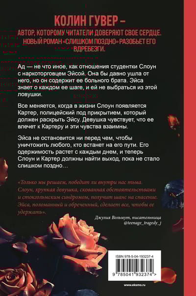 Колин Гувер — литературный феномен нашего времени, троекратная обладательница премии Goodreads Choice Award в номинации «Любовный роман». Ее произведения переведены на десятки языков. Она — мировой тренд. Продажи книг Колин Гувер превысили продажи Стивена Кинга и Джорджа Мартина.
