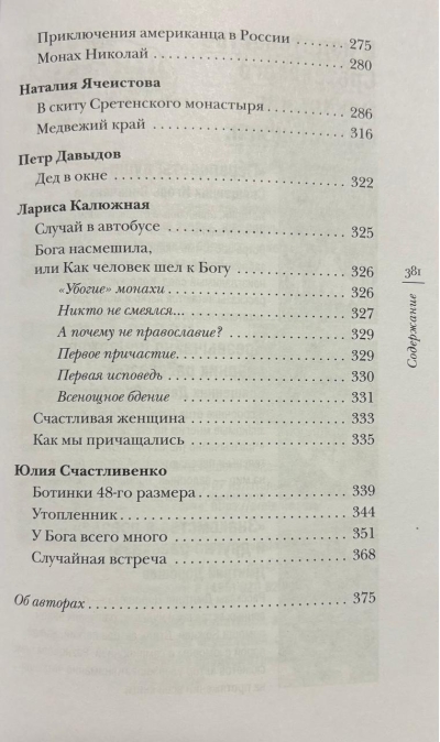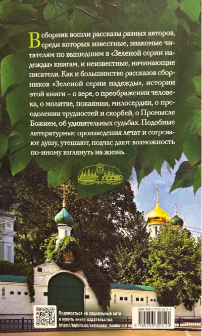 В сборник вошли рассказы разных авторов, среди которых известные, знакомые читателям по вышедшим в «Зеленой серии надежды» книгам, и неизвестные, начинающие писатели. Как и большинство рассказов «Зеленой серии надежды», истории этой книги — о вере, о преображении человека, о молитве, покаянии, милосердии, о преодолении трудностей и скорбей, о Промысле Божием, об удивительных судьбах. Подобные литературные произведения лечат и согревают душу, утешают, подчас дают возможность по-иному взглянуть на жизнь. Два рассказа посвящены почившим насельникам Сретенского монастыря — монаху Николаю (Муромцеву) и иеромонаху Нилу (Григорьеву), о котором митрополит Тихон (Шевкунов) написал в книге «Несвятые святые».