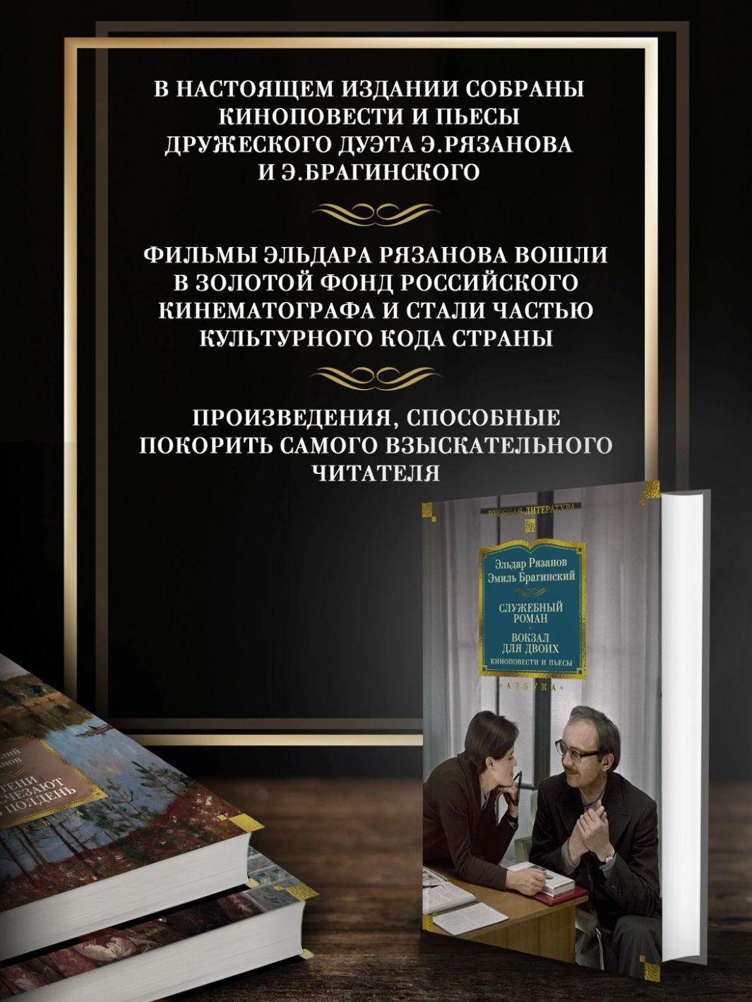 Фильмы Эльдара Рязанова давно вошли в золотой фонд российского кинематографа и стали частью культурного кода страны. Они разобраны на цитаты и любимы поколениями зрителей, являясь образцом высочайшего уровня режиссерского мастерства. И к литературной основе своих картин Эльдар Рязанов подходил с такой же высокой мерой. Киноповести, большая часть которых была создана в соавторстве с Эмилем Брагинским, — это не просто сценарии для комедий, а полноценные литературные произведения, способные очаровать самого взыскательного читателя.