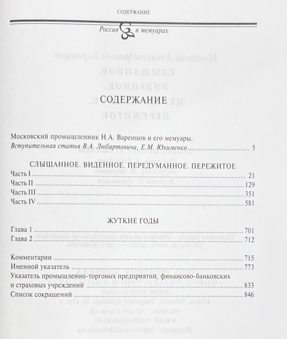 Воспоминания видного московского предпринимателя и общественного деятеля Николая Александровича Варенцова (1862–1947) охватывают период с середины XIX века по 1905 год. В них описана история становления и развития крупнейших московских фирм, банков, торговых домов, даны яркие характеристики их владельцев; книга содержит бытовые зарисовки купеческой жизни Москвы, а также изложение драматических и анекдотических событий из жизни известных московских предпринимателей (Алексеевых, Бахрушиных, Коноваловых, Морозовых, Рябушинских, Хлудовых и др.).