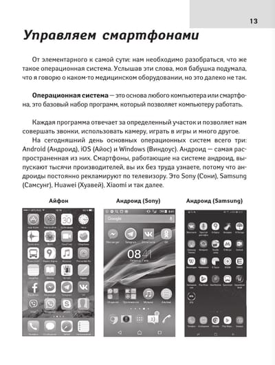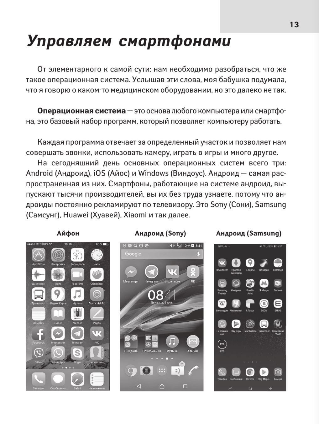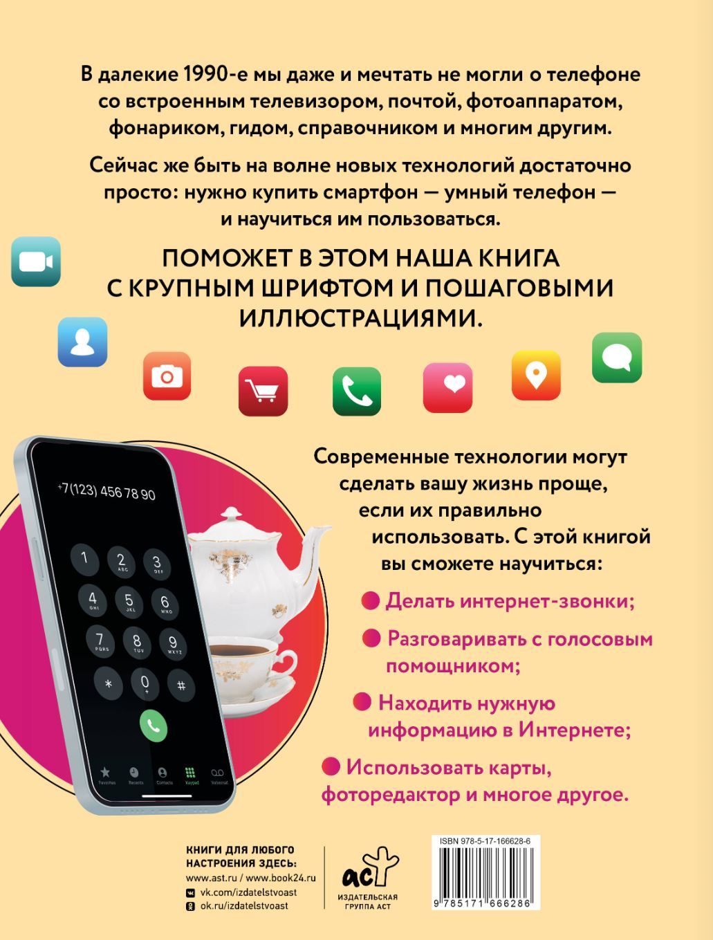 В далекие 1990-е мы даже и мечтать не могли о телефоне со встроенным телевизором, почтой, фотоаппаратом, фонариком, гидом, справочником и многим другим. Сейчас же быть на волне новых технологий достаточно просто: нужно купить смартфон – умный телефон - и научиться им пользоваться. Поможет в этом наша книга с крупным шрифтом и пошаговыми иллюстрациями.