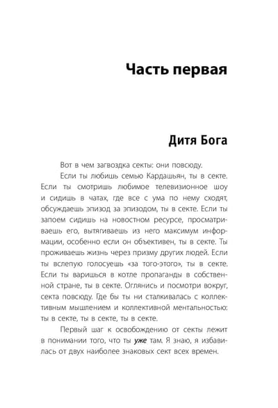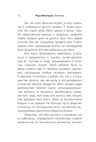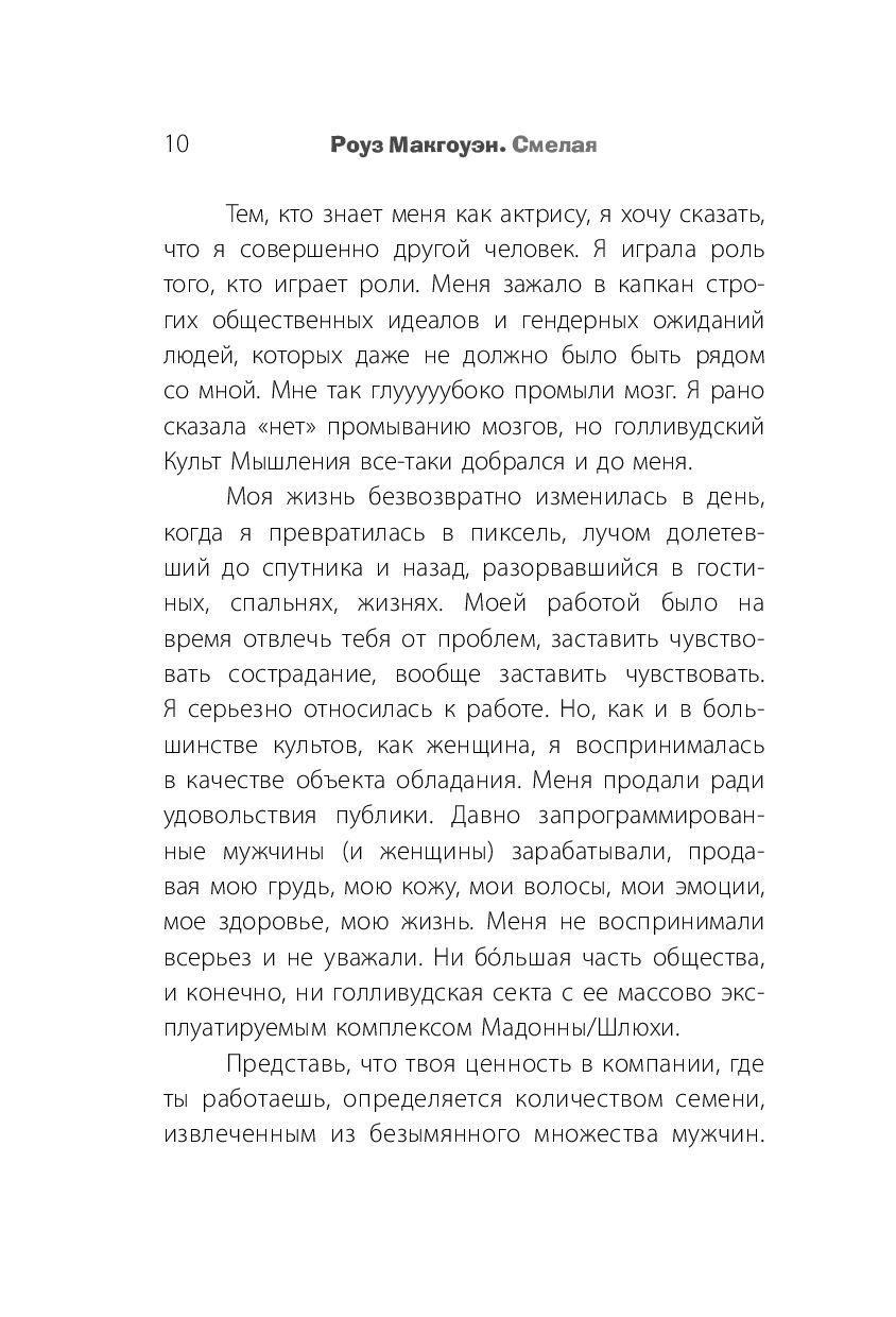 «Жизнь, как ты узнаешь из книги, бросала меня из одного культа в другой. В своей жизни, как ты узнаешь из книги, я попадала под влияние то одного культа, то другого. «Смелая» - это история о том, как я боролась с этими культами и смогла вернуть себе жизнь. Я хочу помочь тебе сделать то же самое». Роуз Макгоуэн