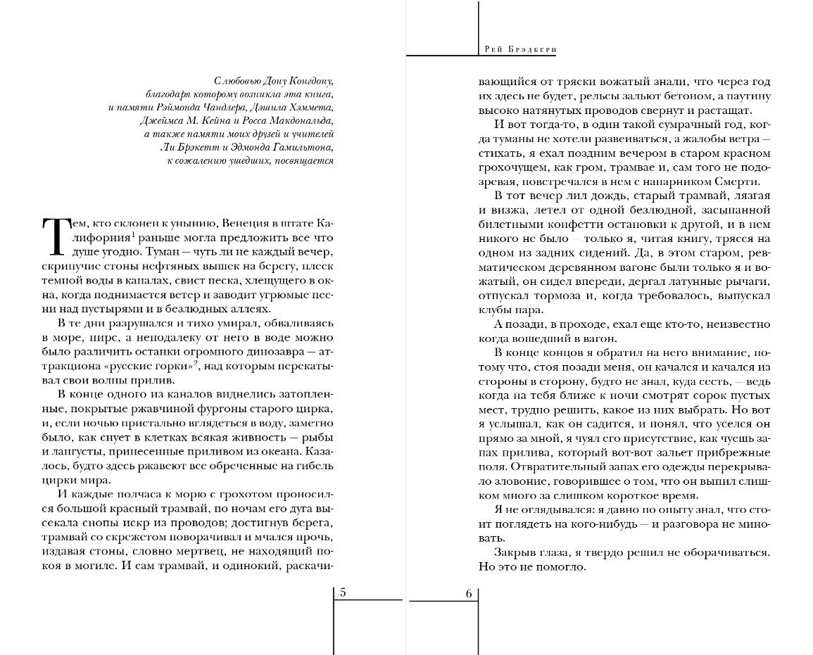 Магический реализм его прозы, рукотворные механизмы радости, переносящие человека из настоящего в волшебные миры детства, чудо приобщения к великой тайне Литературы, щедро раздариваемое читателю, давно вывели Рэя Брэдбери на классическую орбиту. Роман Брэдбери, написанный через двадцать с лишним лет после «Надвигается беда», удивил всех.