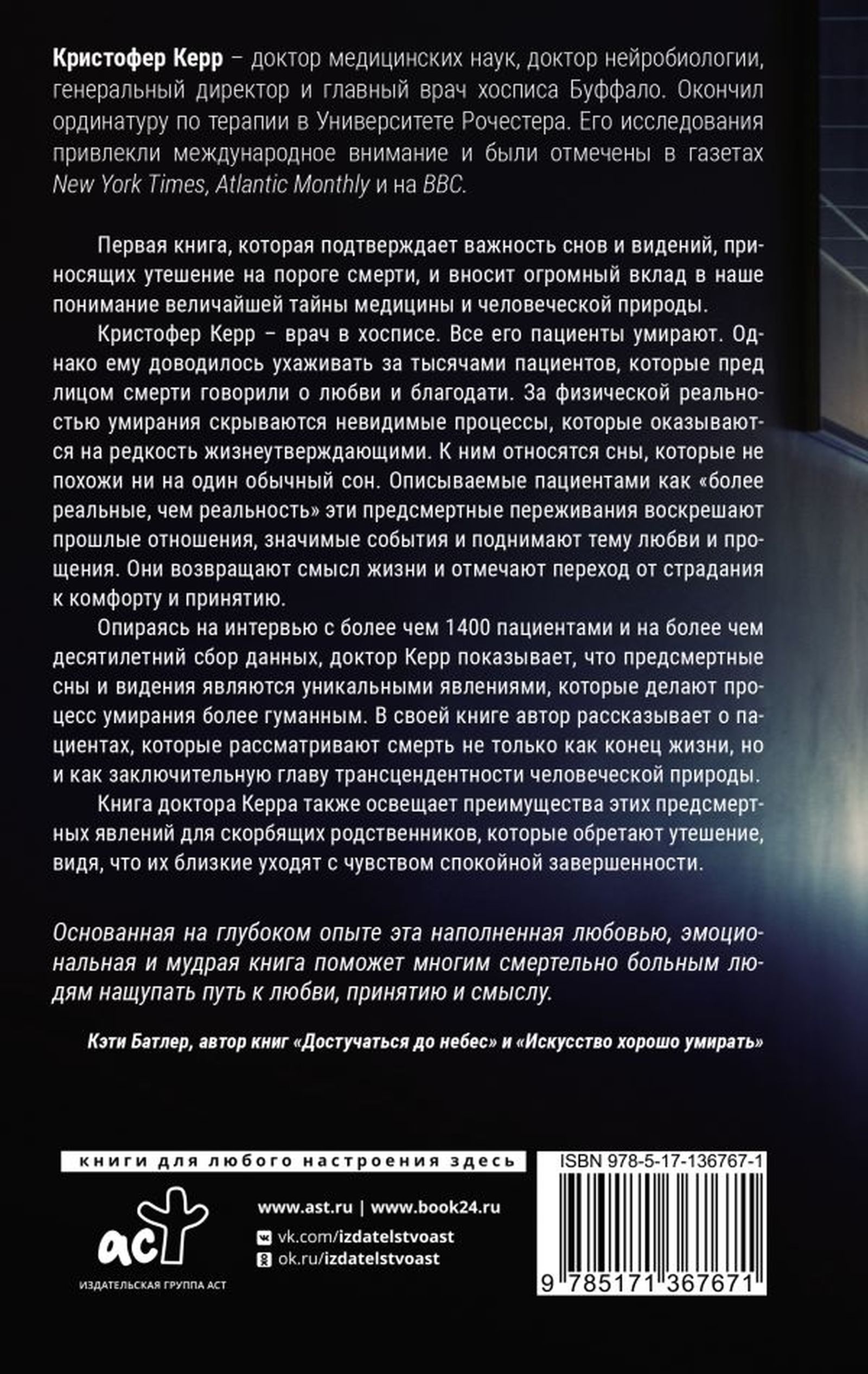 Опираясь на интервью с более чем 1400 пациентами и на более чем десятилетний сбор данных, доктор Керр показывает, что предсмертные сны и видения являются уникальными явлениями, которые делают процесс умирания более гуманным. В своей книге автор рассказывает о пациентах, которые рассматривают смерть не только как конец жизни, но и как заключительную главу трансцендентности человеческой природы. Книга доктора Керра также освещает преимущества этих предсмертных явлений для скорбящих родственников, которые обретают утешение, видя, что их близкие уходят с чувством спокойной завершенности.