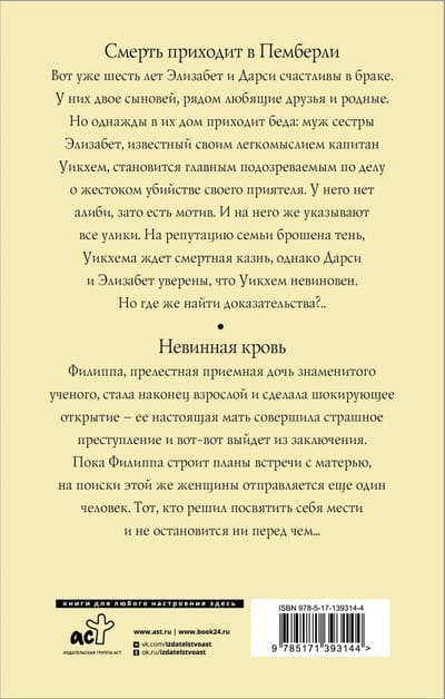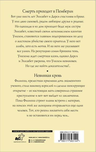 Вот уже шесть лет Элизабет и Дарси счастливы в браке. У них двое сыновей, рядом любящие друзья и родные. Но однажды в их дом приходит беда: муж сестры Элизабет, известный своим легкомыслием капитан Уикхем, становится главным подозреваемым по делу о жестоком убийстве своего приятеля. У него нет алиби, зато есть мотив. И на него же указывают все улики. На репутацию семьи брошена тень, Уикхема ждет смертная казнь, однако Дарси и Элизабет уверены, что Уикхем невиновен. Но где же найти доказательства?.. Филиппа, прелестная приемная дочь знаменитого ученого, стала наконец взрослой и сделала шокирующее открытие — ее настоящая мать совершила страшное преступление и вот вот выйдет из заключения. Пока Филиппа строит планы встречи с матерью, на поиски этой же женщины отправляется еще один человек. Тот, кто решил посвятить себя мести и не остановится ни перед чем...