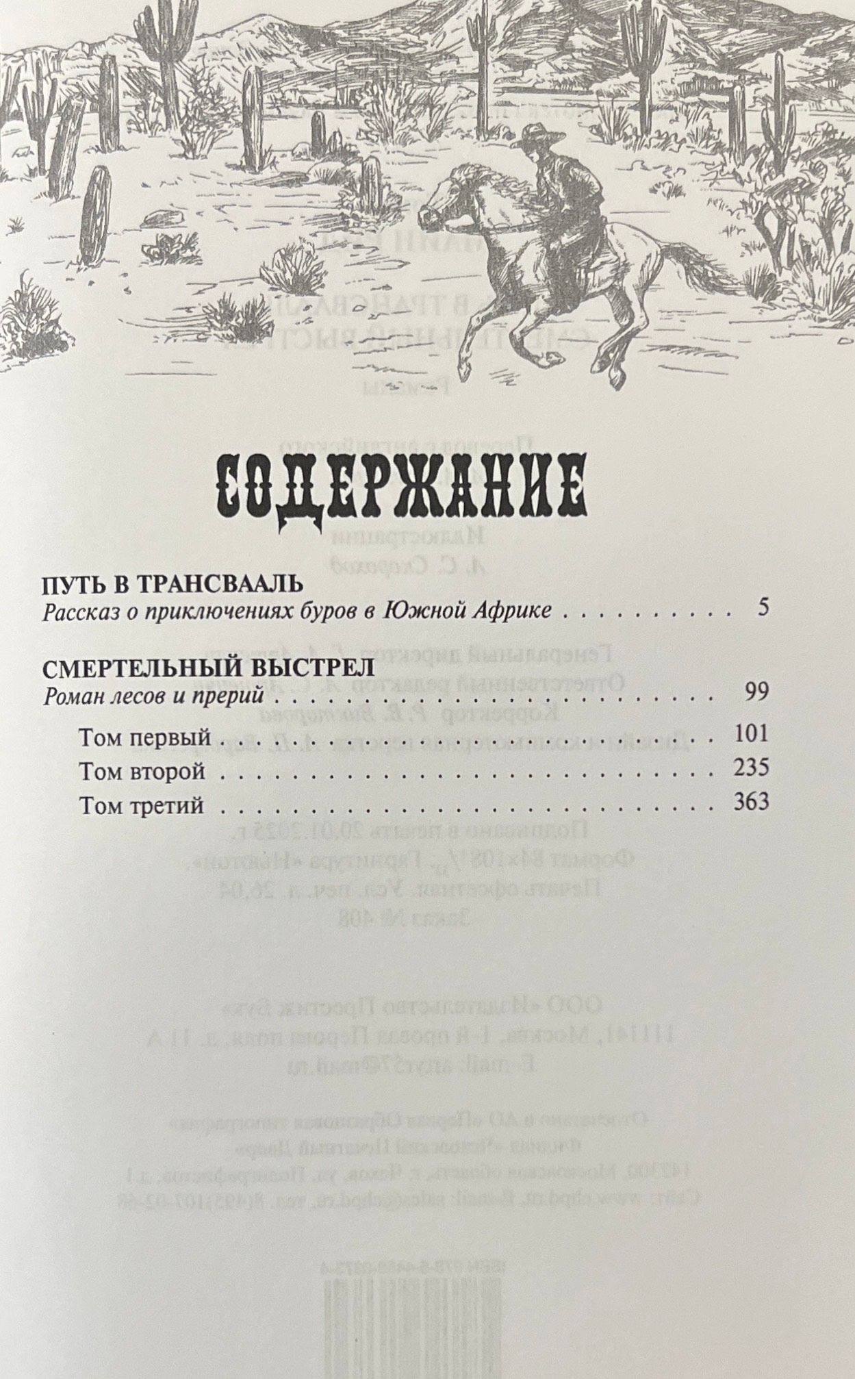 Опасности на каждом шагу подстерегают караван повозок голландских крестьян-переселенцев в поисках земель для основания поселения в Африке. Это и львы, и крокодилы, и мухи цеце, и конечно же тропическая жара. Таков сюжет повести «Путь в Трансвааль».