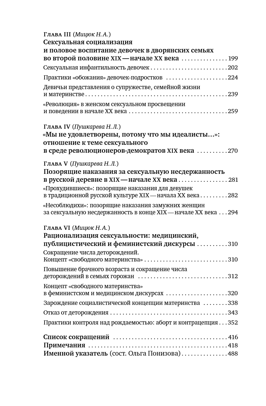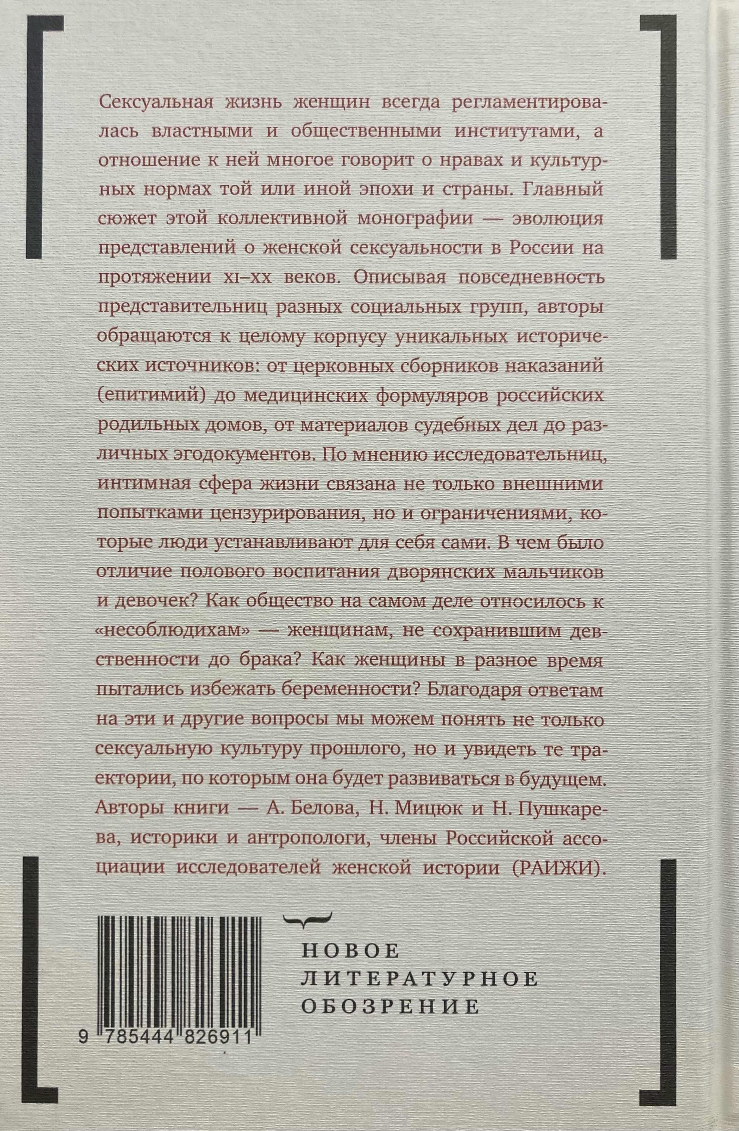 Сексуальная жизнь женщин всегда регламентировалась властными и общественными институтами, а отношение к ней многое говорит о нравах и культурных нормах той или иной эпохи и страны. Главный сюжет этой коллективной монографии — эволюция представлений о женской сексуальности в России на протяжении XI–ХХ веков. Описывая повседневность представительниц разных социальных групп, авторы обращаются к целому корпусу уникальных исторических источников: от церковных сборников наказаний (епитимий) до медицинских формуляров российских родильных домов, от материалов судебных дел до различных эгодокументов. По мнению исследовательниц, интимная сфера жизни связана не только внешними попытками цензурирования, но и ограничениями, которые люди устанавливают для себя сами. В чем было отличие полового воспитания дворянских мальчиков и девочек? Как общество на самом деле относилось к «несоблюдихам» — женщинам, не сохранившим девственности до брака? Как женщины в разное время пытались избежать беременности? Благодаря ответам на эти и другие вопросы мы можем не только понять сексуальную культуру прошлого, но и увидеть те траектории, по которым она будет развиваться в будущем. Авторы книги — А. Белова, Н. Мицюк и Н. Пушкарева, историки и антропологи, члены Российской ассоциации исследователей женской истории (РАИЖИ).