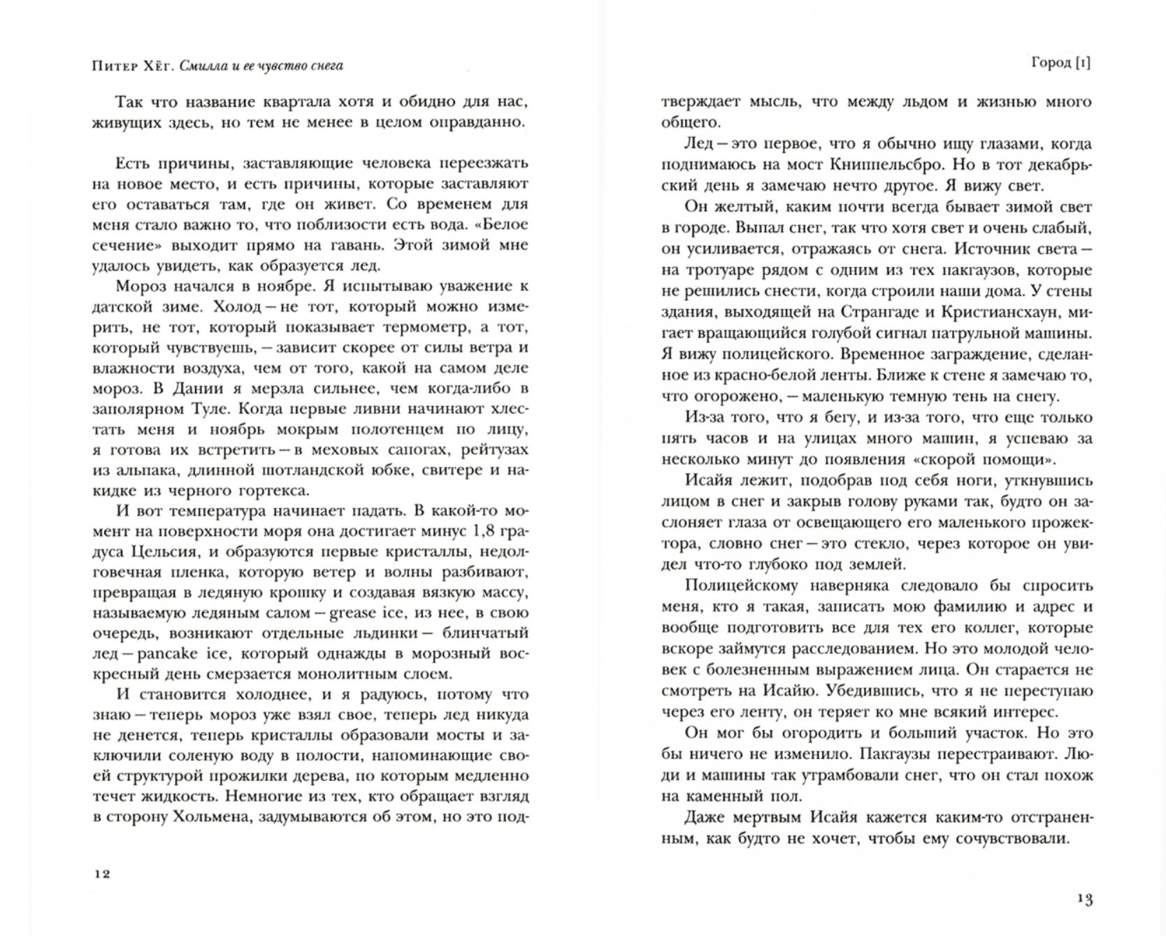 Она читает снег, как раскрытую книгу. Она верит числам, но не верит людям. Особенно – официальным лицам, тем, кто пытается ей доказать, что мальчик-гренландец просто играл на крыше и случайно сорвался вниз. Потому что она знает, как сильно он боялся высоты. Потому что следы на снегу ведут прямо к краю. И это не следы играющего ребенка. Она – Смилла Кваавигаак Ясперсен, полудатчанка-полуэскимоска, родившаяся в Гренландии, живущая в Копенгагене. Для нее с этой смерти начинается поиск ответов на вопросы, поставленные недомолвками, голосом на старой кассете, полосами на рентгеновском снимке. Поиск, который уводит ее все дальше: город – море – лед.