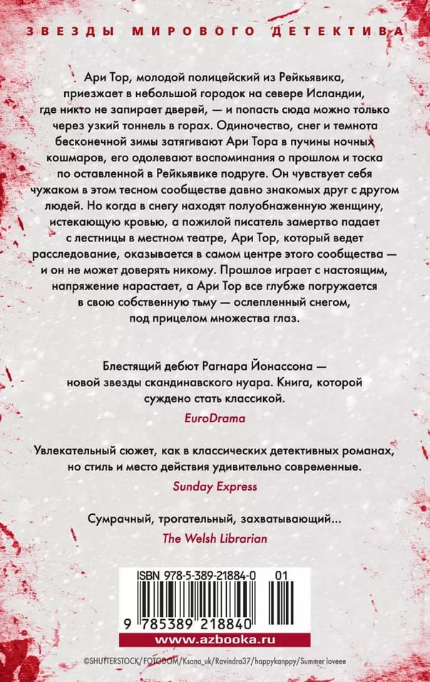 Ари Тор, молодой полицейский из Рейкьявика, приезжает в небольшой городок на севере Исландии, где никто не запирает дверей, — и попасть сюда можно только через узкий тоннель в горах. Одиночество, снег и темнота бесконечной зимы затягивают Ари Тора в пучины ночных кошмаров, его одолевают воспоминания о прошлом и тоска по оставленной в Рейкьявике подруге. Он чувствует себя чужаком в этом тесном сообществе давно знакомых друг с другом людей. Но когда в снегу находят полуобнаженную женщину, истекающую кровью, а пожилой писатель замертво падает с лестницы в местном театре, Ари Тор, который ведет расследование, оказывается в самом центре этого сообщества — и он не может доверять никому. Прошлое играет с настоящим, напряжение нарастает, а Ари Тор все глубже погружается в свою собственную тьму — ослепленный снегом, под прицелом множества глаз.