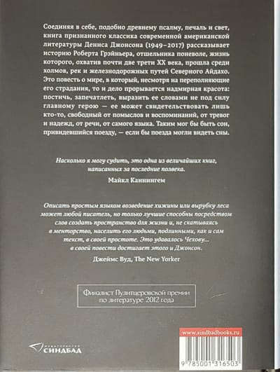 Соединяя в себе, подобно древнему псалму, печаль и свет, книга признанного классика современной американской литературы Дениса Джонсона (1949–2017) рассказывает историю Роберта Грэйньера, отшельника поневоле, жизнь которого, охватив почти две трети ХХ века, прошла среди холмов, рек и железнодорожных путей Северного Айдахо. Это повесть о мире, в который, несмотря на переполняющие его страдания, то и дело прорывается надмирная красота: постичь, запечатлеть, выразить ее словами не под силу главному герою — ее может свидетельствовать лишь кто-то, свободный от помыслов и воспоминаний, от тревог и надежд, от речи, от самого языка. Таким мог бы быть сон, привидевшийся поезду, — если бы поезда могли видеть сны.