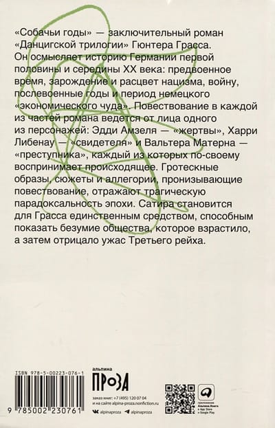 «Собачьи годы» — заключительный роман «Данцигской трилогии» Гюнтера Грасса. Он осмысляет историю Германии первой половины и середины XX века: предвоенное время, зарождение и расцвет нацизма, войну, послевоенные годы и период немецкого «экономического чуда». Повествование в каждой из частей романа ведется от лица одного из персонажей: Эдди Амзеля — «жертвы», Харри Либенау — «свидетеля» и Вальтера Матерна — «преступника», каждый из которых по-своему воспринимает происходящее. Гротескные образы, сюжеты и аллегории, пронизывающие повествование, отражают трагическую парадоксальность эпохи. Cатира становится для Грасса единственным средством, способным показать безумие общества, которое взрастило, а затем отрицало ужас Третьего рейха.