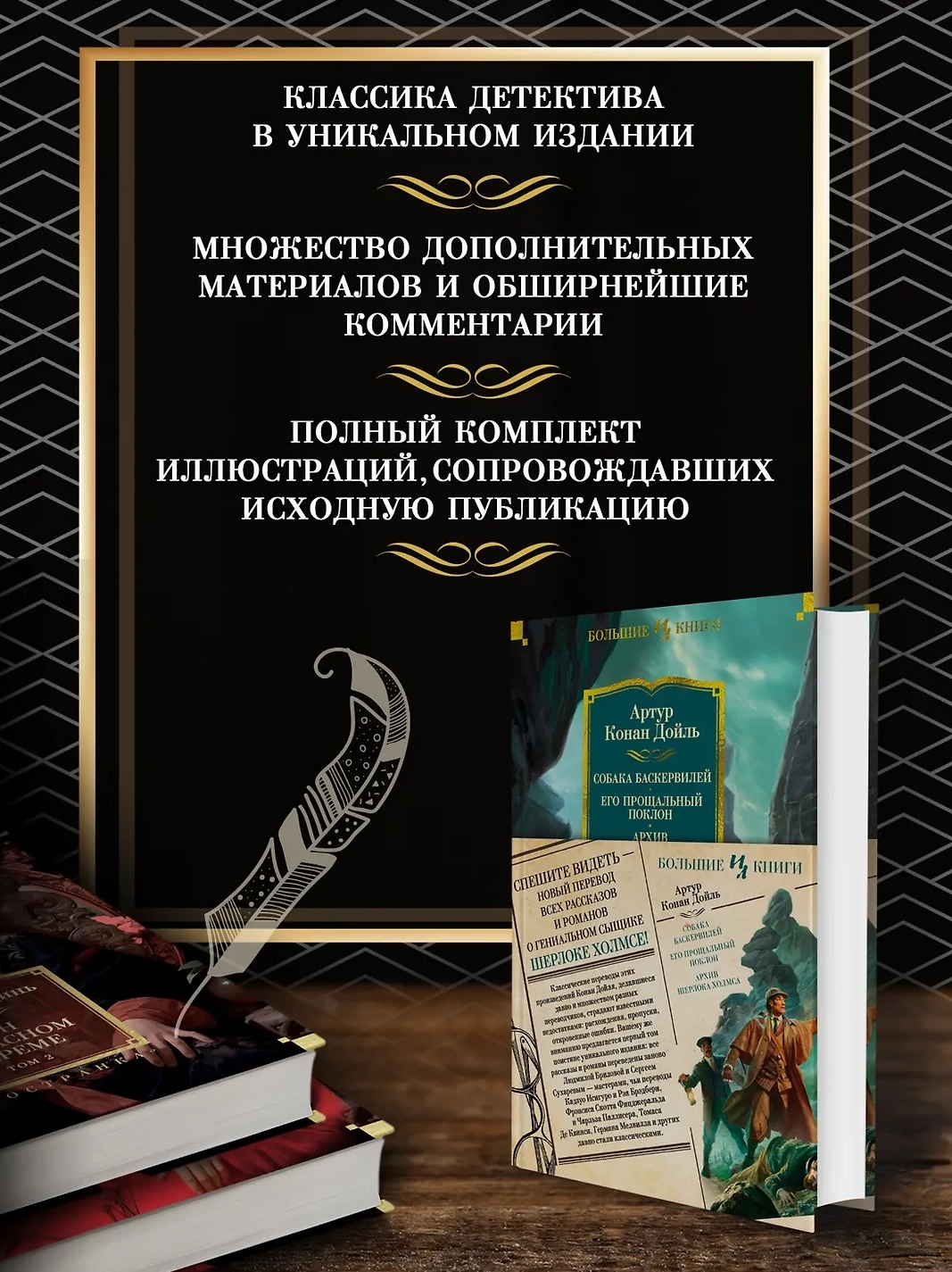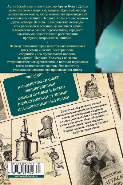 Английский врач и писатель сэр Артур Конан Дойль известен всему миру как непревзойдённый мастер детективного жанра, автор множества произведений о гениальном сыщике Шерлоке Холмсе и его верном друге докторе Ватсоне. Классические переводы этих рассказов и романов, делавшиеся давно и множеством разных переводчиков, страдают известными недостатками: расхождения, пропуски, откровенные ошибки. Вашему вниманию предлагается заключительный том (роман «Собака Баскервилей», сборники «Его прощальный поклон» и «Архив Шерлока Холмса») из давно готовившегося четырёхтомника с полным переводом всего холмсовского канона. Это воистину уникальное издание: все произведения цикла переведены заново Людмилой Бриловой и Сергеем Сухаревым — мастерами, чьи переводы Кадзуо Исигуро и Рэя Брэдбери, Фрэнсиса Скотта Фицджеральда и Чарльза Паллисера, Томаса Де Квинси, Германа Мелвилла и других давно стали классическими. При этом в каждый том включено множество дополнительных материалов: предисловия к ранним публикациям, воспоминания Конан Дойля, касающиеся тех или иных произведений, некоторые интервью писателя. Плюс каждый том снабжён обширнейшими комментариями и богато иллюстрирован лучшими классическими рисунками. В данную книгу включён полный комплект иллюстраций, сопровождавших исходную публикацию в журнале «Стрэнд» романа «Собака Баскервилей» и всех рассказов из обоих сборников — иллюстраций Сидни Пэджета, Уолтера Пэджета, Гилберта Холидея и других художников.
