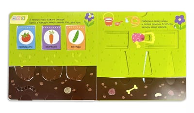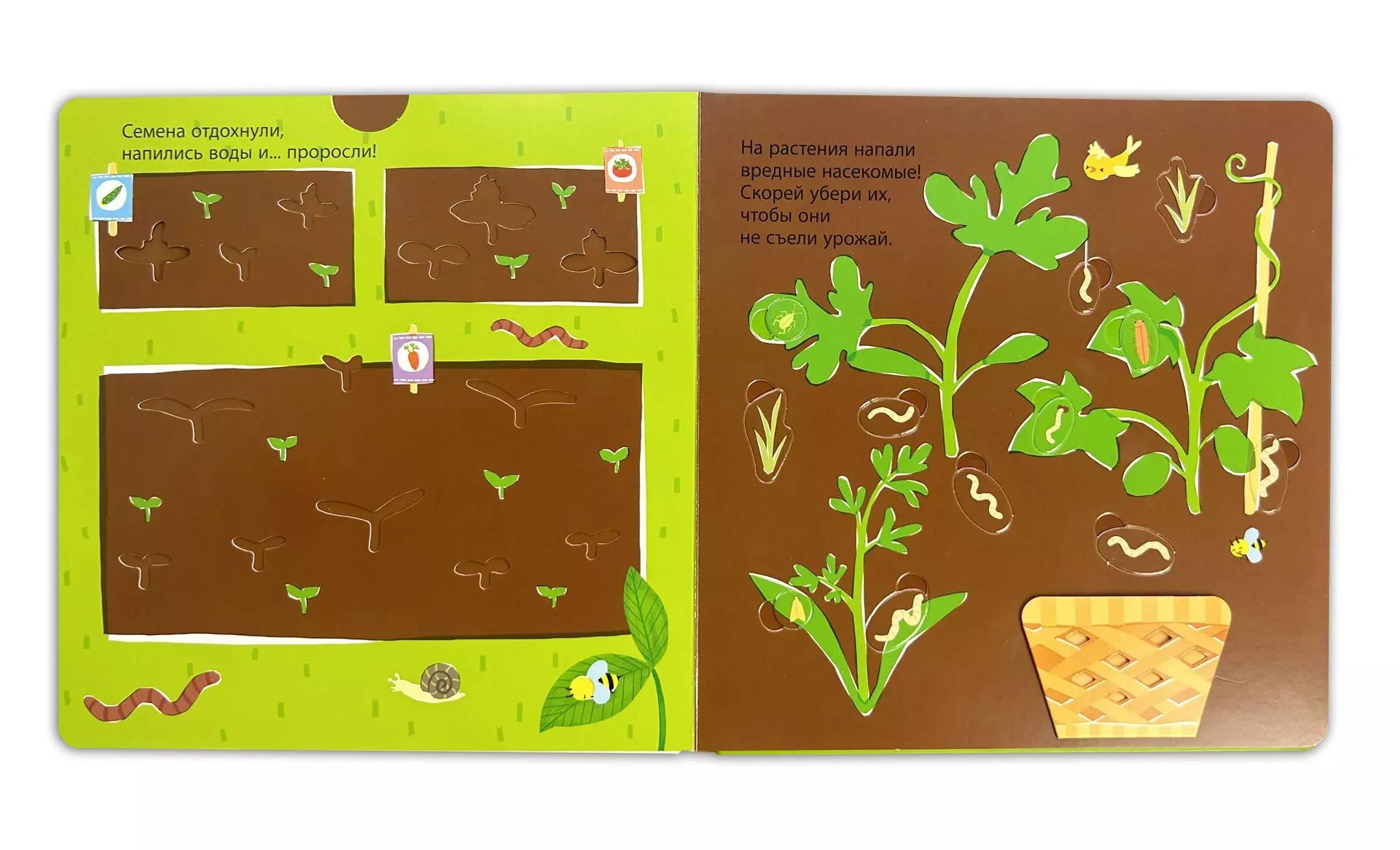 Собираем урожай. Невероятно увлекательная 3D-книга для детей — на каждом развороте расположены интерактивные элементы, которые помогут максимально наглядно объяснить ребёнку, как растут растения. Хочешь вырастить свой первый урожай? Тогда открывай книжку-игрушку, бери лопатку, совочек, грабли и принимайся за дело. Благодаря подвижным элементам прямо на страничках книги ты сможешь выкопать ямки, прорыхлить землю, посадить и полить семена, а в конце — собрать зрелые овощи в корзину. Теперь у тебя есть свой маленький огород. Данная развивающая книга отлично подходит для детей 3-4 лет. Интерактивные элементы помогают в развитии мелкой моторики. Познаём мир вместе.