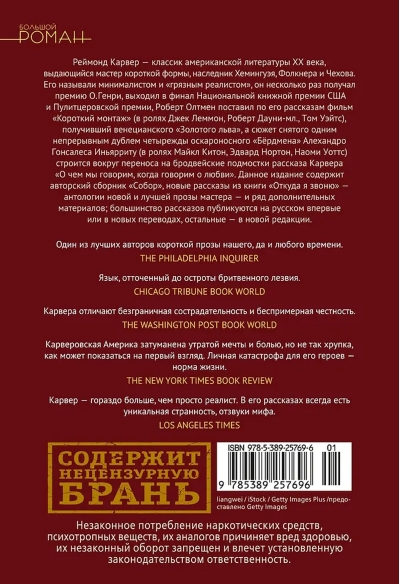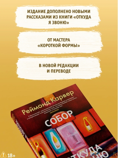 Реймонд Карвер — классик американской литературы XX века, выдающийся мастер короткой формы, наследник Хемингуэя, Фолкнера и Чехова. Его называли минималистом и «грязным реалистом», однако «в его рассказах всегда есть уникальная странность, отзвуки мифа» (Los Angeles Times). Он несколько раз получал премию О. Генри, выходил в финал Национальной книжной премии США и Пулитцеровской премии, Роберт Олтмен поставил по его рассказам фильм «Короткий монтаж» (в ролях Энди Макдауэлл, Джек Леммон, Джулианна Мур, Роберт Дауни-мл., Тим Роббинс, Том Уэйтс), получивший «Золотого льва» на Венецианском кинофестивале, а сюжет снятого одним непрерывным дублем четырежды оскароносного «Бёрдмена» Алехандро Гонсалеса Иньярриту (в ролях Майкл Китон, Эдвард Нортон, Эмма Стоун, Наоми Уоттс) строится вокруг переноса на бродвейские подмостки рассказа Карвера «О чем мы говорим, когда говорим о любви». Данное издание содержит авторский сборник «Собор», новые рассказы из книги «Откуда я звоню» — антологии новой и лучшей прозы мастера — и ряд дополнительных материалов; большинство рассказов публикуются на русском впервые или в новых переводах, остальные — в новой редакции.