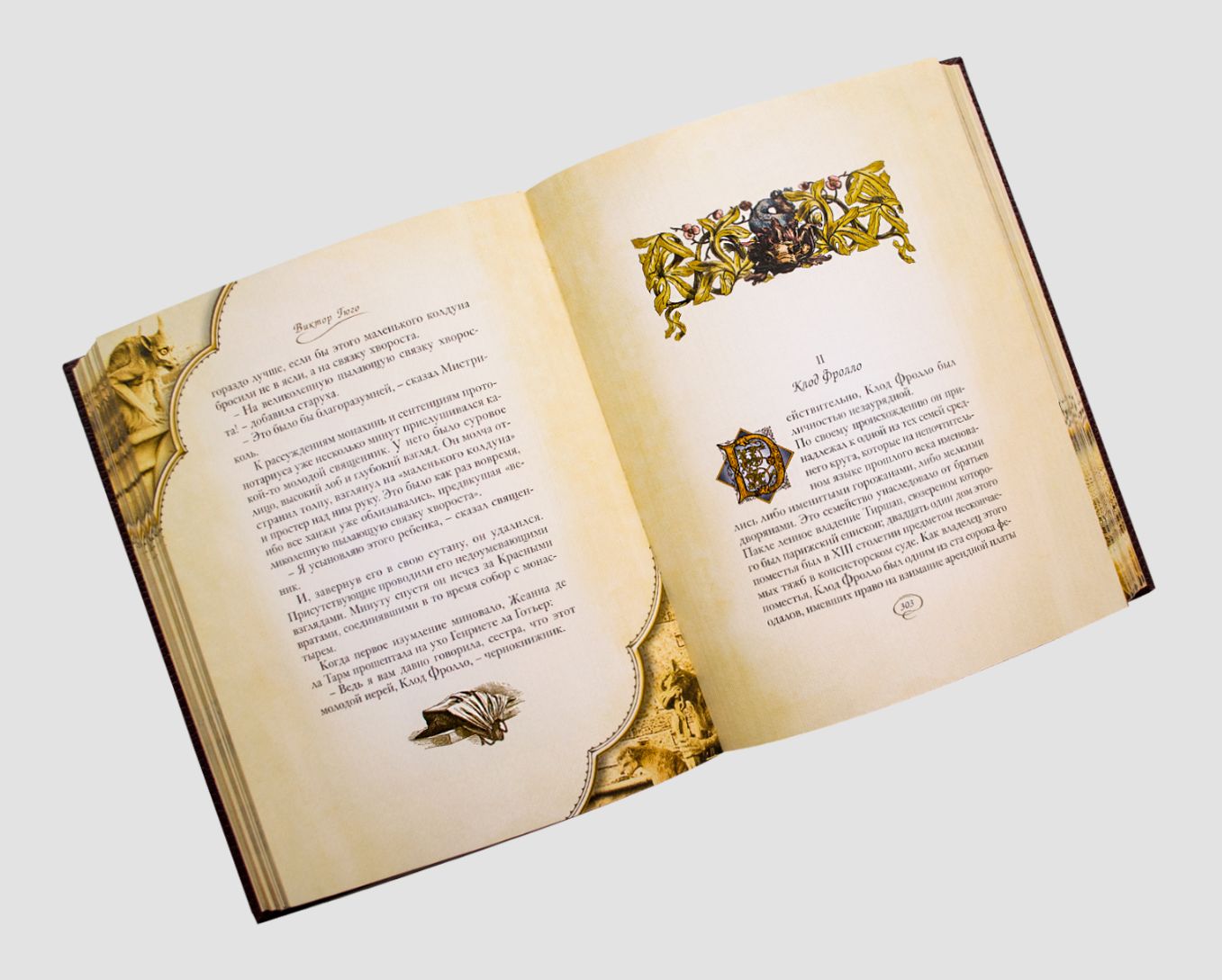 Оригинальные колонтитульные заставки, изящные буквицы в сочетании с трехсторонним золотым обрезом, шелковым ляссе и уникальным переплетом с тиснением 9-ю различными цветами фольги являются достойным обрамлением этого подлинного шедевра книгоиздания.