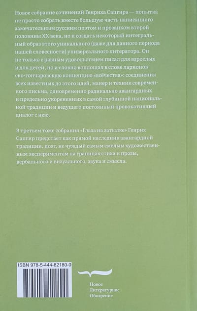 Новое собрание сочинений Генриха Сапгира — попытка не просто собрать вместе большую часть написанного замечательным русским поэтом и прозаиком второй половины ХX века, но и создать некоторый интегральный образ этого уникального (даже для данного периода нашей словесности) универсального литератора. Он не только с равным удовольствием писал для взрослых и для детей, но и словно воплощал в слове ларионовско-гончаровскую концепцию «всёчества»: соединения всех известных до этого идей, манер и техник современного письма, одновременно радикально авангардных и предельно укорененных в самой глубинной национальной традиции и ведущего постоянный провокативный диалог с нею. В третьем томе собрания «Глаза на затылке» Генрих Сапгир предстает как прямой наследник авангардной традиции, поэт, не чуждый самым смелым художественным экспериментам на границах стиха и прозы, вербального и визуального, звука и смысла.