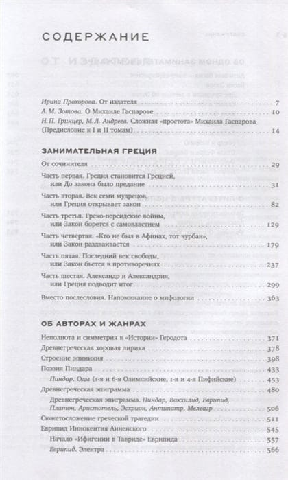 Первое посмертное собрание сочинений М. Л. Гаспарова (в шести томах) ставит своей задачей максимально полно передать многогранность его научных интересов и представить основные направления его исследований. В первый том включены работы Гаспарова по антиковедению, главным образом посвященные Древней Греции. Наряду с аналитическими статьями, составляющими основное содержание тома и объединенными в тематические группы по жанровому и хронологическому принципу, в издание входят предисловия и сопроводительные статьи к переводам древнегреческих памятников. В них предельно сжато и ярко характеризуется как творчество отдельных поэтов (например, Пиндара), так и художественная специфика целого жанра (эпиграммы или басни). Эти статьи неотделимы от собственно переводов, фрагменты которых включены в каждый тематический раздел, поскольку в понимании Гаспарова перевод — едва ли не главная форма осмысления античного наследия. Главная в том числе и потому, что своей важнейшей задачей он считал приблизить к пониманию античности максимально широкую аудиторию. Потому этот том открывается «Занимательной Грецией» — одновременно и самым «ненаучным», и самым популярным трудом Гаспарова, посвященным древности. В нем как нельзя лучше прослеживается идея, объединяющая все столь разнообразные работы ученого: сделать античные тексты и античных авторов не просто понятными, но и говорящими языком естественным и близким читателю современной эпохи.